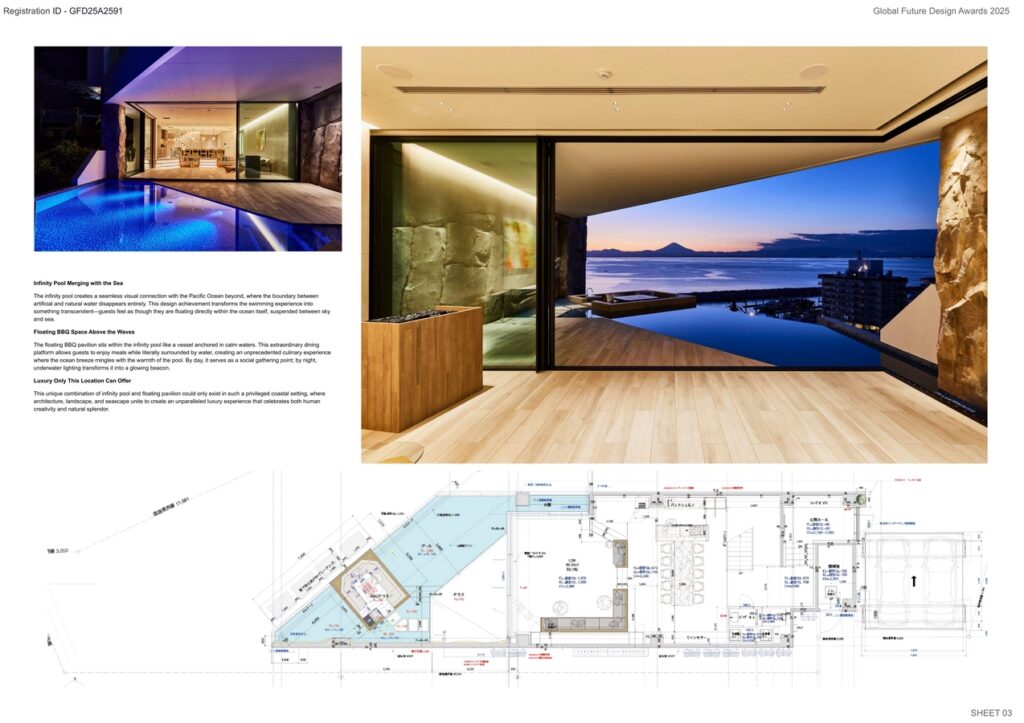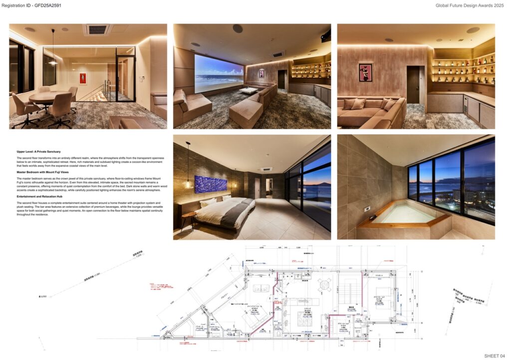 During daylight hours, the residence serves as a transparent vessel framing the Pacific’s endless expanse through floor-to-ceiling glass walls that seamlessly integrate with the structure. The main living area opens entirely to panoramic vistas, where Mount Fuji’s sacred silhouette creates a contemplative focal point against the azure sky. This iconic mountain, long revered as a symbol of natural beauty and spiritual significance in Japanese culture, appears between sea and sky as a sacred axis, offering calm centrality to daily life.