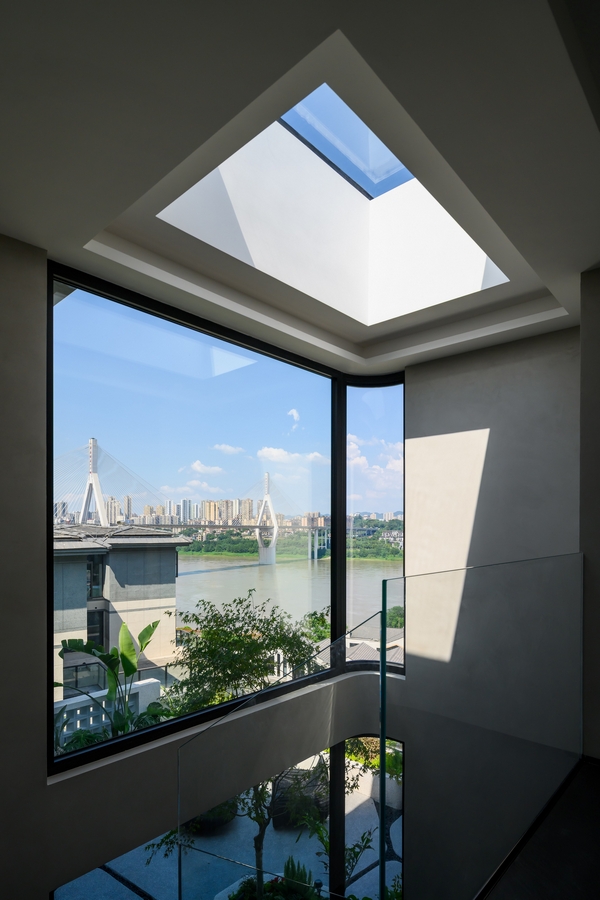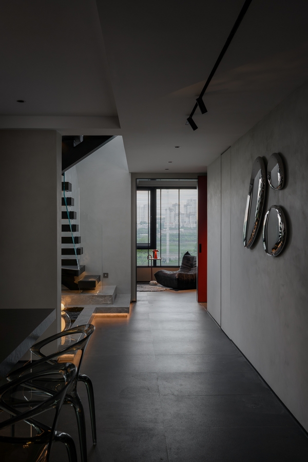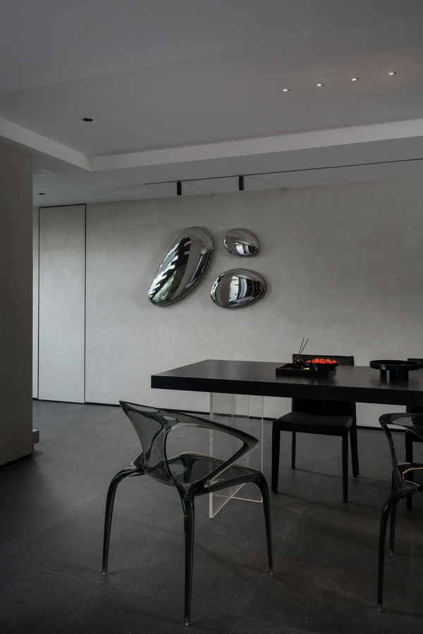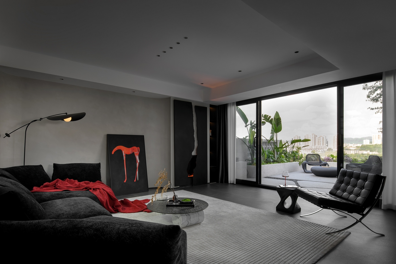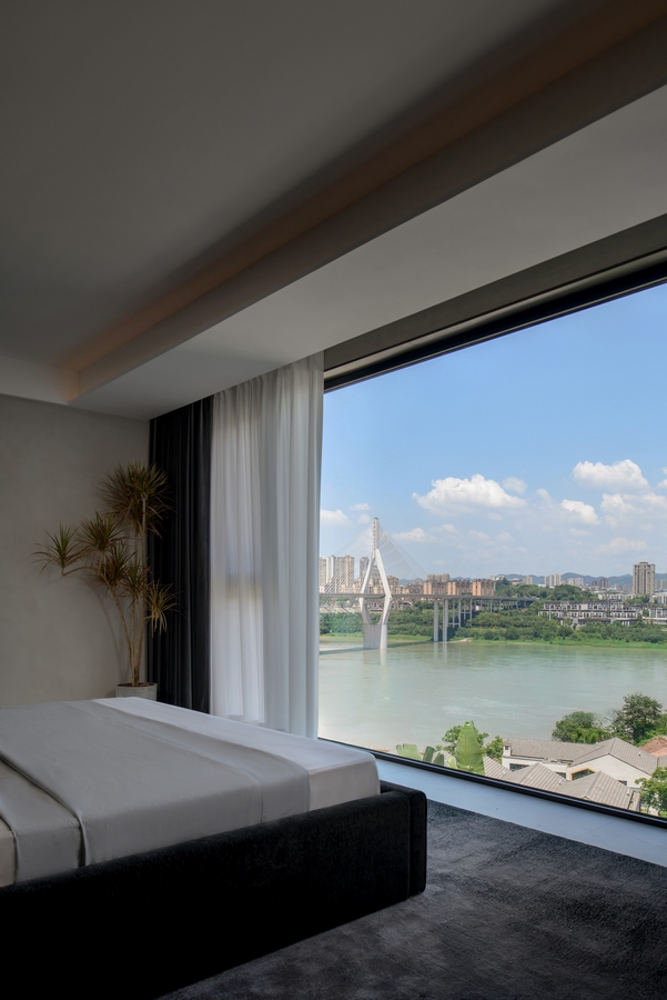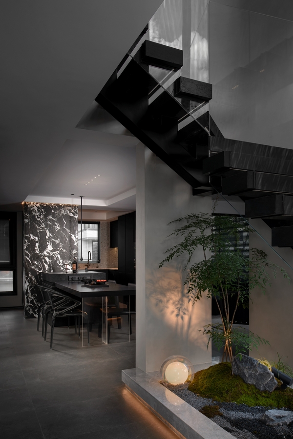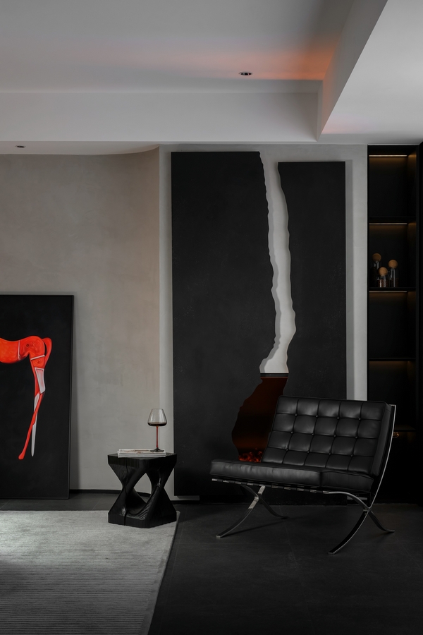 The floating staircase is centered on the garden,Equipped with full floor-to-ceiling glass and a sun skylight,The scenery changes with every step. Large area of blank wall in the living roomPerfectly combined with the fireplace shape,Using steel material to create a cracked feeling, the fireplace is looming behind, giving a feeling of holding a pipa half-hidden, and the flame light and shadow of the fireplace will also appear in the steel plate cracksIt has a better extension. Master bedroom的The bed is positioned to face the entire river view, and this side of the window is made into an extra-large piece of floor-to-ceiling glass.Every day, you can see the beautiful river view at the first glance when you wake up. The large floor-to-ceiling glass frames the scenery into a painting, allowing the scenery to be completely integrated into the interior.At the headboard backgroundDesign on,Give upTraditional PU stone skin, use cement and fiberglass to shape,用SculptureTechnique,让The entire wall is more complete, without splicing seams,From a rigid decorative material to a work of art. Centered on the garden, the best landscape is introduced into the interior, so that the interior and exterior echo each other, allowing the architecture and landscape to “symbiotically coexist.” Black is the end of all colors,Low-key and aloof, high-end and mysterious。