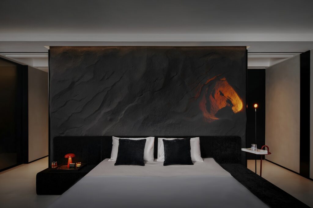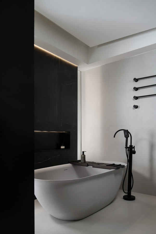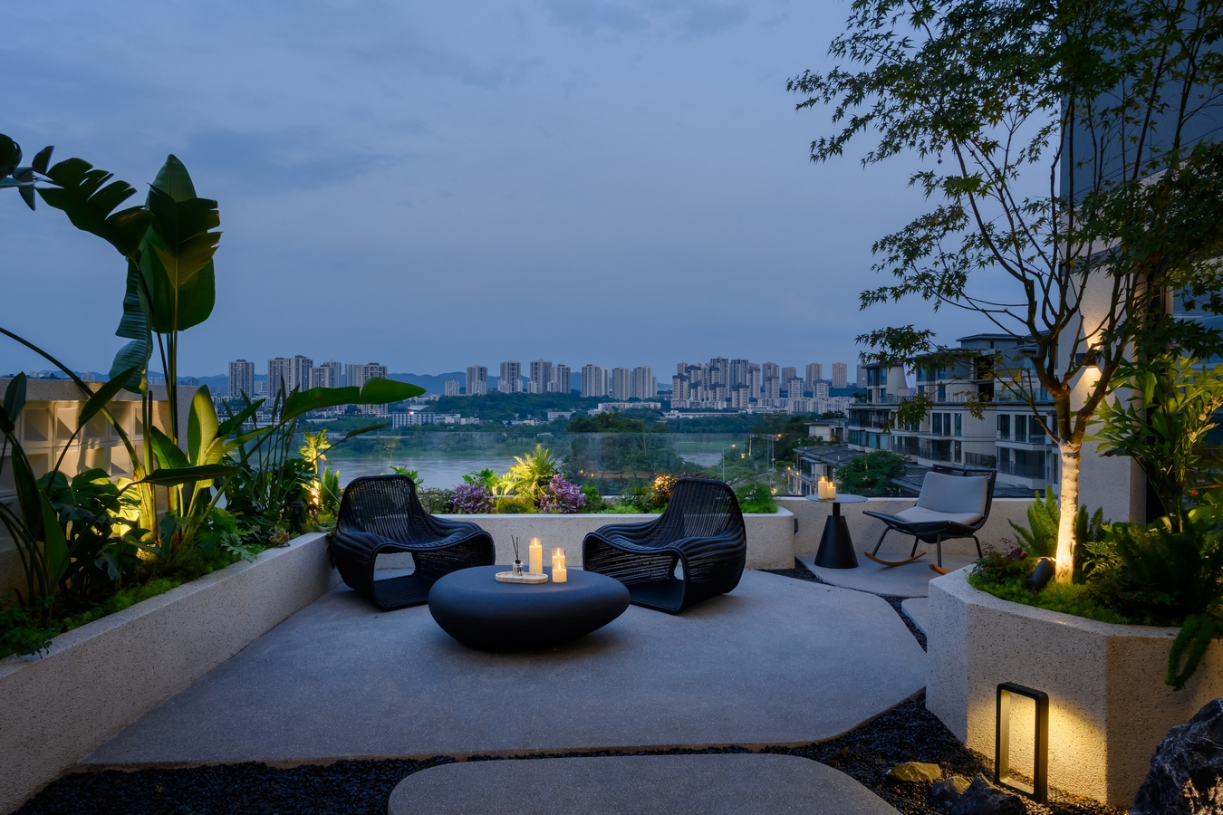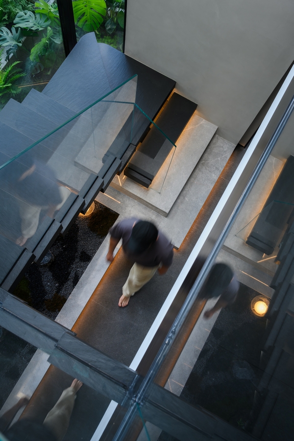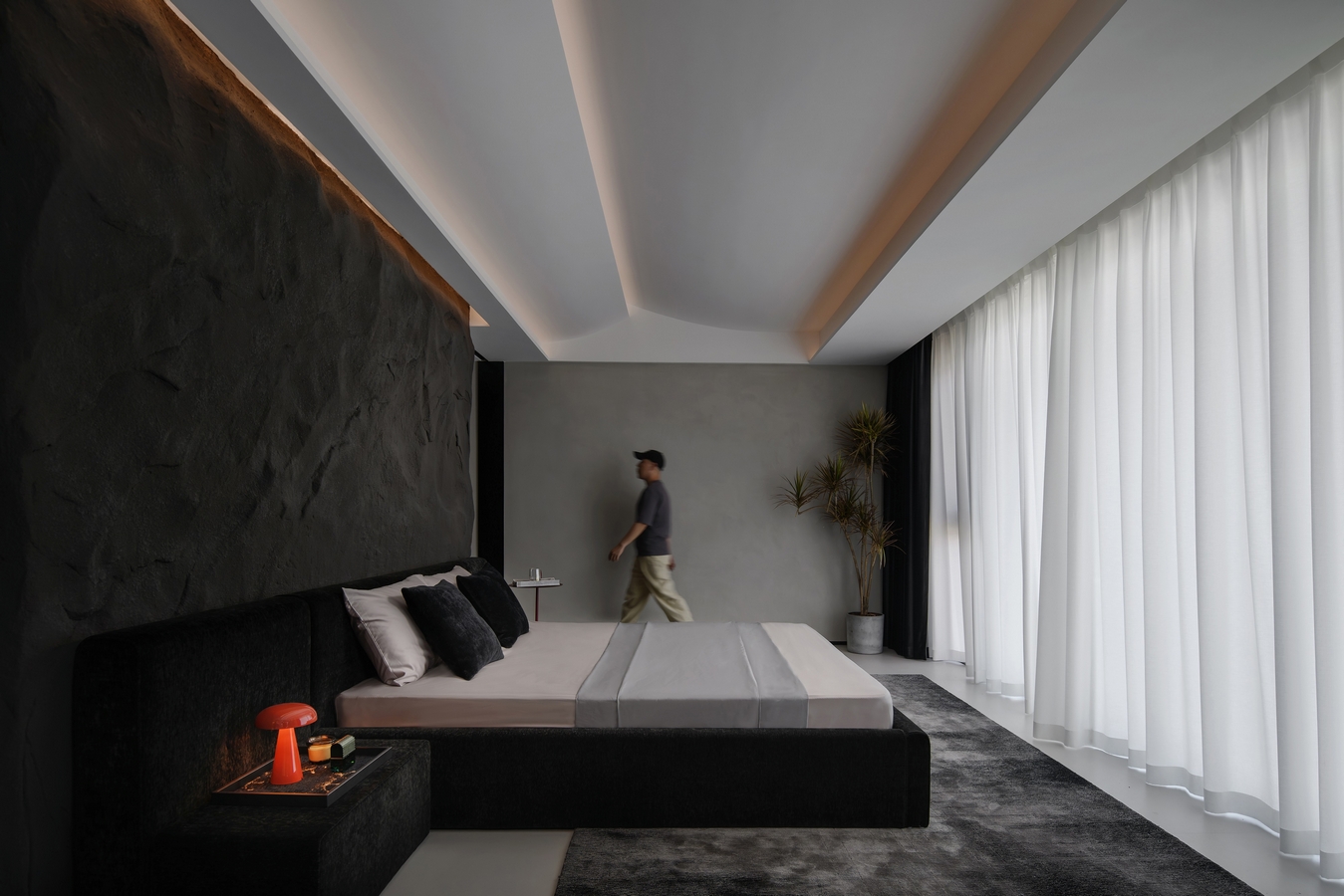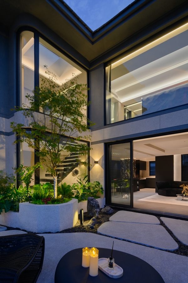 The floating staircase is centered on the garden,Equipped with full floor-to-ceiling glass and a sun skylight,The scenery changes with every step. Large area of blank wall in the living roomPerfectly combined with the fireplace shape,Using steel material to create a cracked feeling, the fireplace is looming behind, giving a feeling of holding a pipa half-hidden, and the flame light and shadow of the fireplace will also appear in the steel plate cracksIt has a better extension. Master bedroom的The bed is positioned to face the entire river view, and this side of the window is made into an extra-large piece of floor-to-ceiling glass.Every day, you can see the beautiful river view at the first glance when you wake up. The large floor-to-ceiling glass frames the scenery into a painting, allowing the scenery to be completely integrated into the interior.At the headboard backgroundDesign on,Give upTraditional PU stone skin, use cement and fiberglass to shape,用SculptureTechnique,让The entire wall is more complete, without splicing seams,From a rigid decorative material to a work of art. Centered on the garden, the best landscape is introduced into the interior, so that the interior and exterior echo each other, allowing the architecture and landscape to “symbiotically coexist.” Black is the end of all colors,Low-key and aloof, high-end and mysterious。