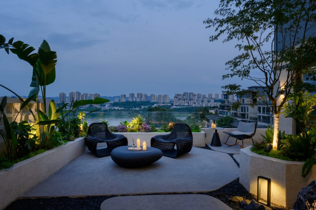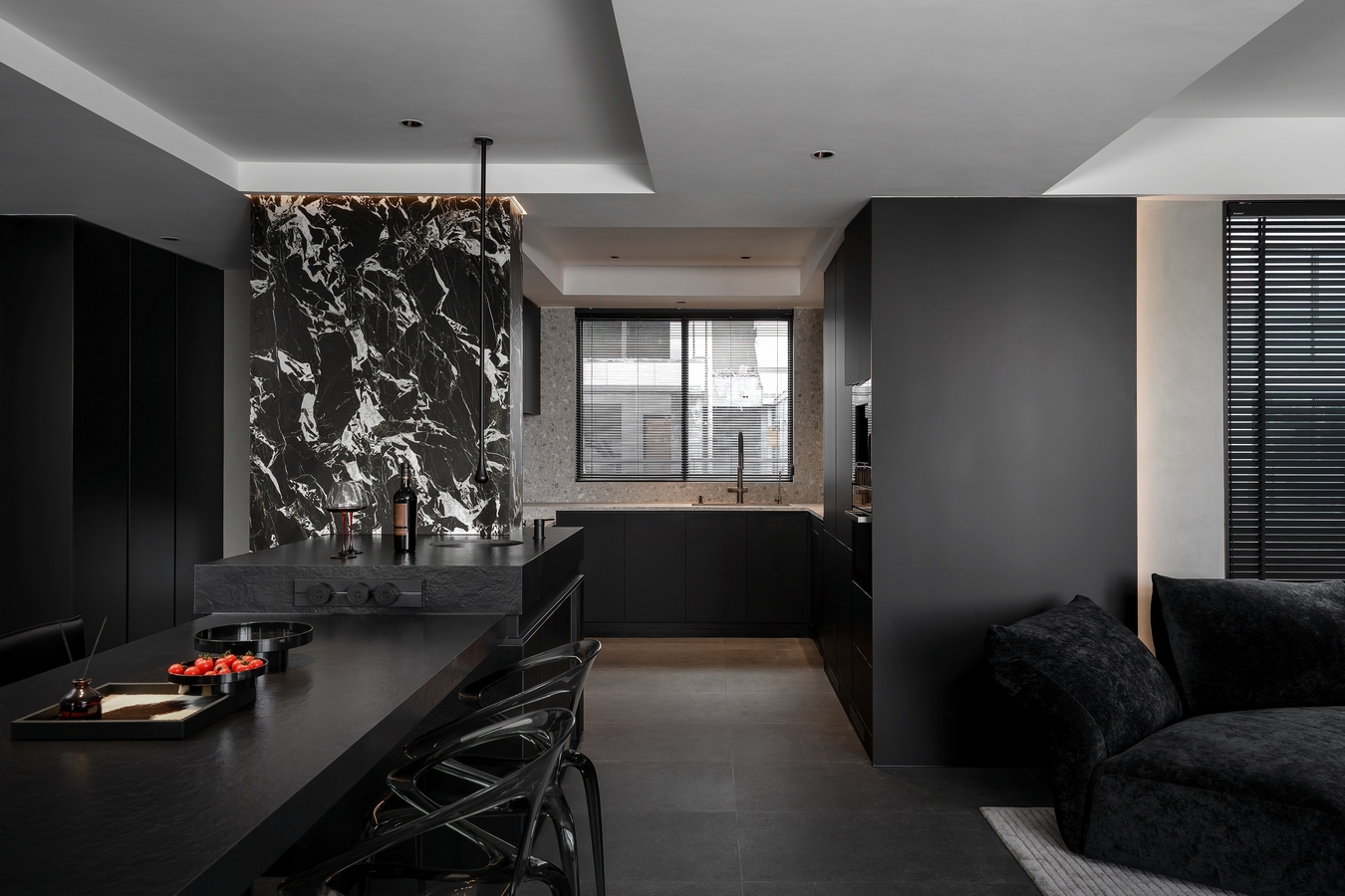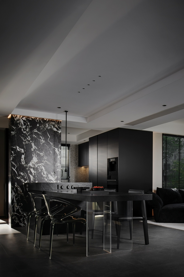 The design without a living room breaks the traditional layout. The sofa is placed facing the garden, bringing the garden landscape into full view. Large areas of floor-to-ceiling glass are used to better bring outdoor sunlight and landscapes into the interior, breaking the dullness of black. The design of the blinds modifies the sunlight, forming a light and shadow effect, which adds a dynamic atmosphere to the black space. High, medium and low lighting designs were selected, from the main lightless top spotlights, to the mid-level floor lamps, and then to the decorative lights on the walls and decorative cabinets, forming a three-dimensional lighting atmosphere. In order to seamlessly connect the interior with the river view, the entire space adopts a circular flow line: from the small flow line from the open kitchen to the living and dining room, to the large circular flow line between the interior and exterior, the entire space is integrated, and the river view is always an extension of the space during walking.