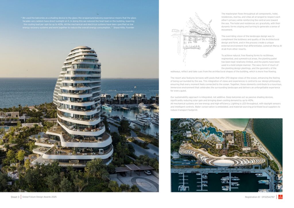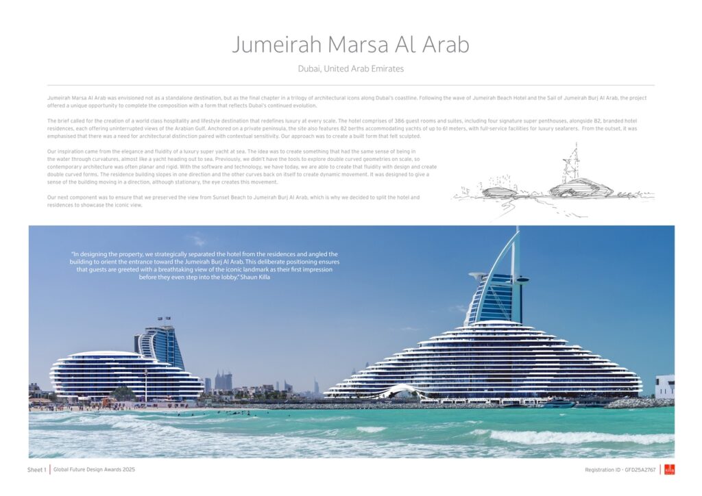 When we began the design process, one of the key objectives was to create a building that would complement, rather than compete with, the iconic Jumeirah Burj Al Arab. The ambition was to complete the trilogy of Jumeirah’s landmark hotels while establishing a new benchmark for the future of design. To achieve this, we first developed a narrative that connected Marsa Al Arab to the wider Jumeirah resort portfolio. Beginning with the traditional Arabic architecture of Jumeirah Al Qasr and Mina Al Salam, moving through the transitional design of Al Naseem, and culminating in the modernist statements of Burj Al Arab and Jumeirah Beach Hotel, the story finds its resolution at Marsa Al Arab. Here, architecture steps into the future, expressed through a sinuous, sculptural form that speaks of innovation and fluidity.