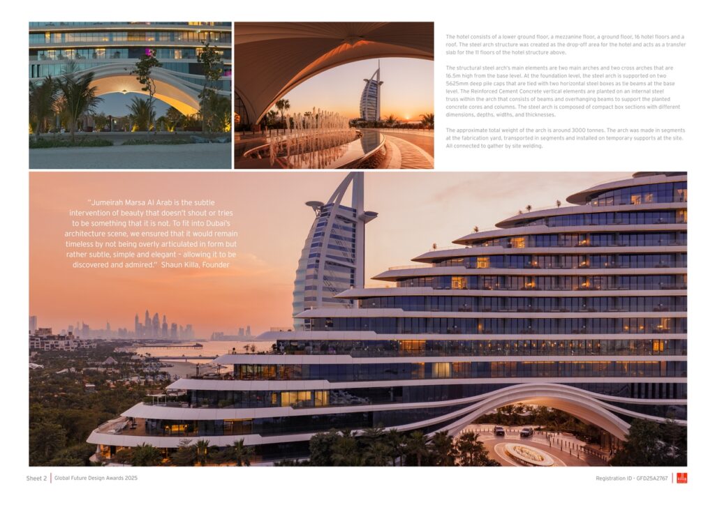 Delivering the vision came with immense technical challenges. Engineering the 36-metre steel arch required unprecedented structural precision, balancing nine floors above while maintaining a sense of visual lightness. The design of cantilevered quay wall villas, suspended over the rock revetment, demanded similarly innovative solutions. These feats exemplify the ambition of the project: pushing structural and architectural boundaries to achieve seamless beauty. More than a hotel, Jumeirah Marsa Al Arab is a dialogue between past, present, and future design. It completes the architectural trilogy of Jumeirah’s beachfront icons, while establishing a bold new vision for luxury hospitality in Dubai.