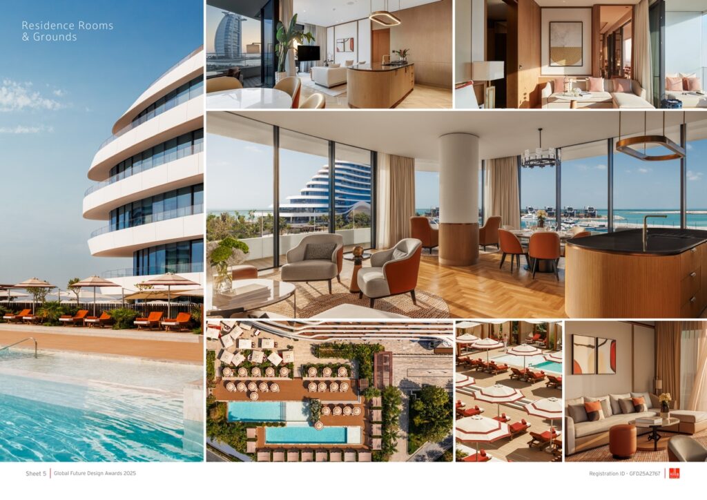 Inside, the architecture continues the narrative of a journey across the sea. The lobby flows forward like the bow of a yacht, extending through lounges, restaurants, and bars that each offer distinct moods and sensory atmospheres. Landscaped gardens, serene walking paths, and lively dining terraces allow guests to choose between tranquillity and vibrancy. Infinity pools and oceanfront terraces provide 270-degree views of the Arabian Gulf, immersing visitors in the sensation of being surrounded by the sea. This connection to the water defines the resort, ensuring every moment feels rooted in nature and the coastal setting.
