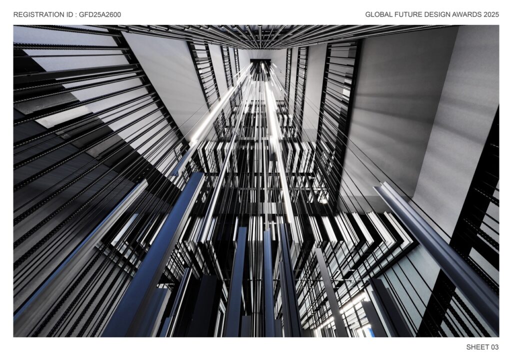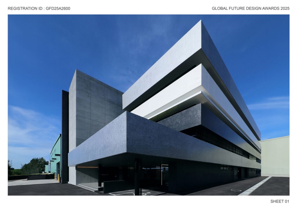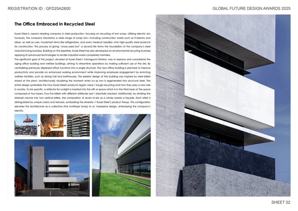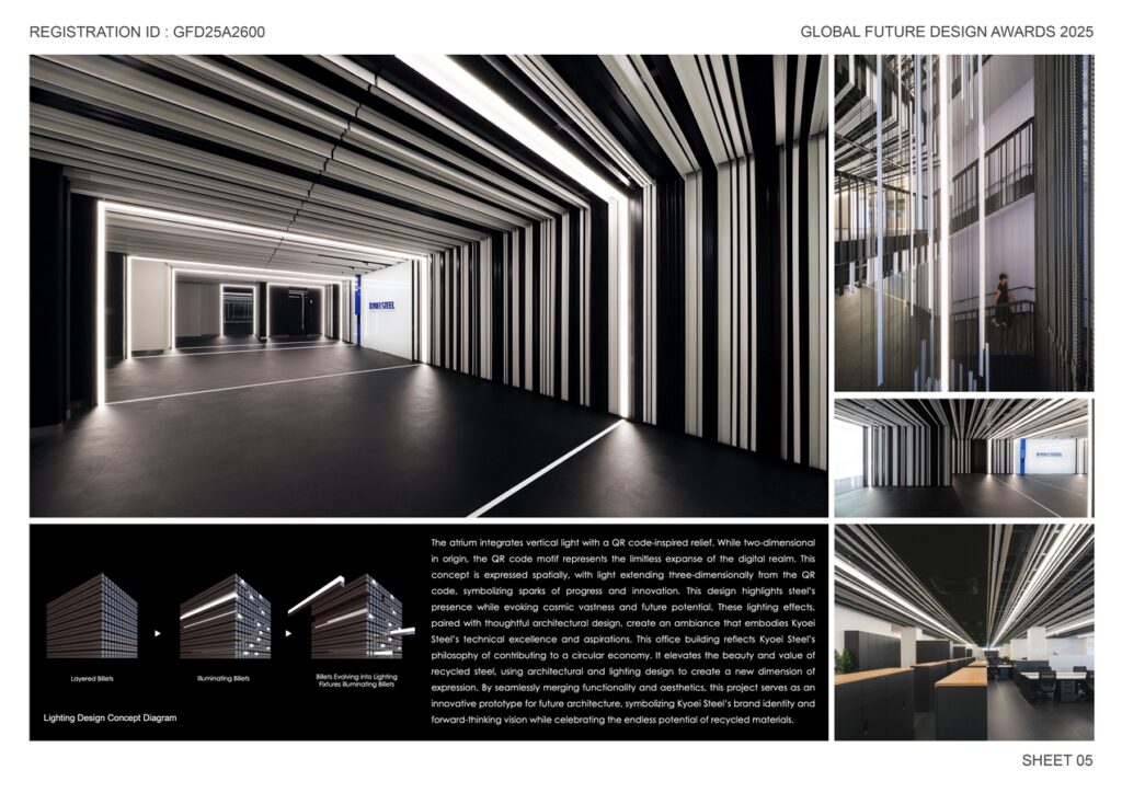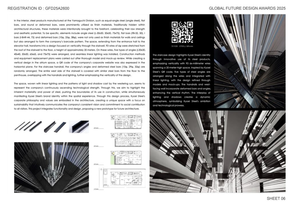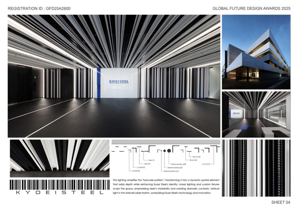 The exterior design, inspired by steel billets stored at the plant, symbolizes regenerating scrap iron into structural steel. The facade features five stacked billets with varied attributes, enhanced by two vertically divided stairwell volumes, forming a composition of seven billets. Each billet’s unique colors and textures reflect Kyoei Steel’s product diversity and identity in a striking aesthetic. Inside, steel products from the Yamaguchi Division, such as equal-angle steel, flat bars, and deformed bars, are prominently featured as finish materials, celebrating their raw strength and aesthetic potential. Materials like angle steel (L30x30, 50×50, 75×75), flat bars (FB-32, 50), I-bars (I-BAR-44, 75), and deformed bars (10φ, 25φ, 38φ) were used for walls, ceilings, and the company’s barcode pattern. This barcode, serving as a symbol of traceability, embodies the company’s commitment to transparency and accountability in its recycling process, visually connecting material flows with corporate identity. The stairwell features 93 wires (6φ) stretched across 20 meters, with five types of angles and seamless lighting. A QR code of the company’s website is integrated into the horizontal plane, while staircase handrails use randomly arranged angles and deformed steel bars. On the west side, similar steel bars cover the stairwell from floor to penthouse, interacting with handrails and lighting to emphasize verticality. This interplay of light, shadow, and raw steel highlights Kyoei Steel’s technological strength and innovative spirit. Dynamic lighting effects embody the company’s brand identity. By showcasing materials and integrating values, the project harmonizes functionality and design. Rooted in the company’s recycling philosophy, it presents a prototype for architecture merging sustainability, innovation, and identity with a unique spatial experience.