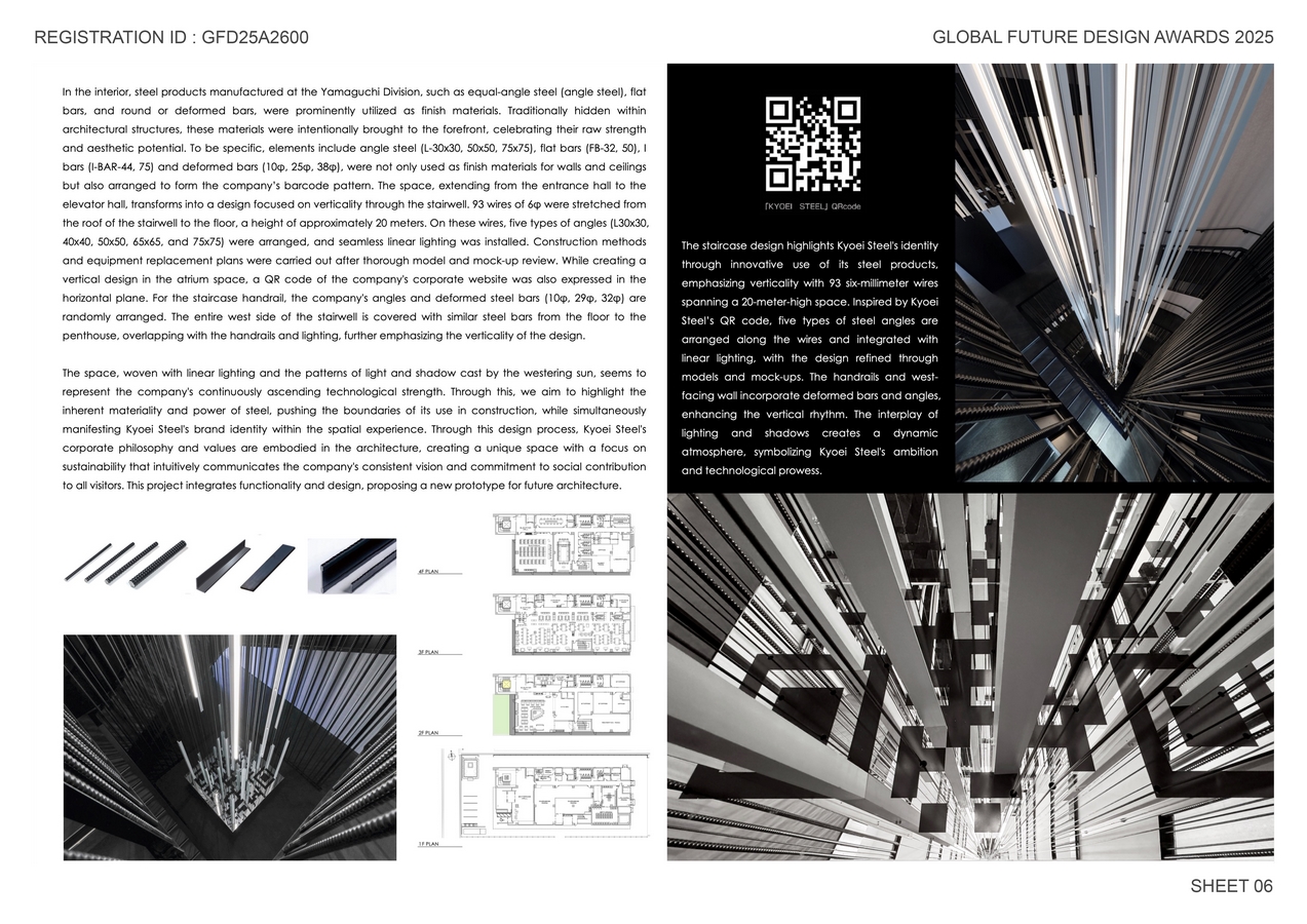 The exterior design, inspired by steel billets stored at the plant, symbolizes regenerating scrap iron into structural steel. The facade features five stacked billets with varied attributes, enhanced by two vertically divided stairwell volumes, forming a composition of seven billets. Each billet’s unique colors and textures reflect Kyoei Steel’s product diversity and identity in a striking aesthetic. Inside, steel products from the Yamaguchi Division, such as equal-angle steel, flat bars, and deformed bars, are prominently featured as finish materials, celebrating their raw strength and aesthetic potential. Materials like angle steel (L30x30, 50×50, 75×75), flat bars (FB-32, 50), I-bars (I-BAR-44, 75), and deformed bars (10φ, 25φ, 38φ) were used for walls, ceilings, and the company’s barcode pattern. This barcode, serving as a symbol of traceability, embodies the company’s commitment to transparency and accountability in its recycling process, visually connecting material flows with corporate identity. The stairwell features 93 wires (6φ) stretched across 20 meters, with five types of angles and seamless lighting. A QR code of the company’s website is integrated into the horizontal plane, while staircase handrails use randomly arranged angles and deformed steel bars. On the west side, similar steel bars cover the stairwell from floor to penthouse, interacting with handrails and lighting to emphasize verticality. This interplay of light, shadow, and raw steel highlights Kyoei Steel’s technological strength and innovative spirit. Dynamic lighting effects embody the company’s brand identity. By showcasing materials and integrating values, the project harmonizes functionality and design. Rooted in the company’s recycling philosophy, it presents a prototype for architecture merging sustainability, innovation, and identity with a unique spatial experience.