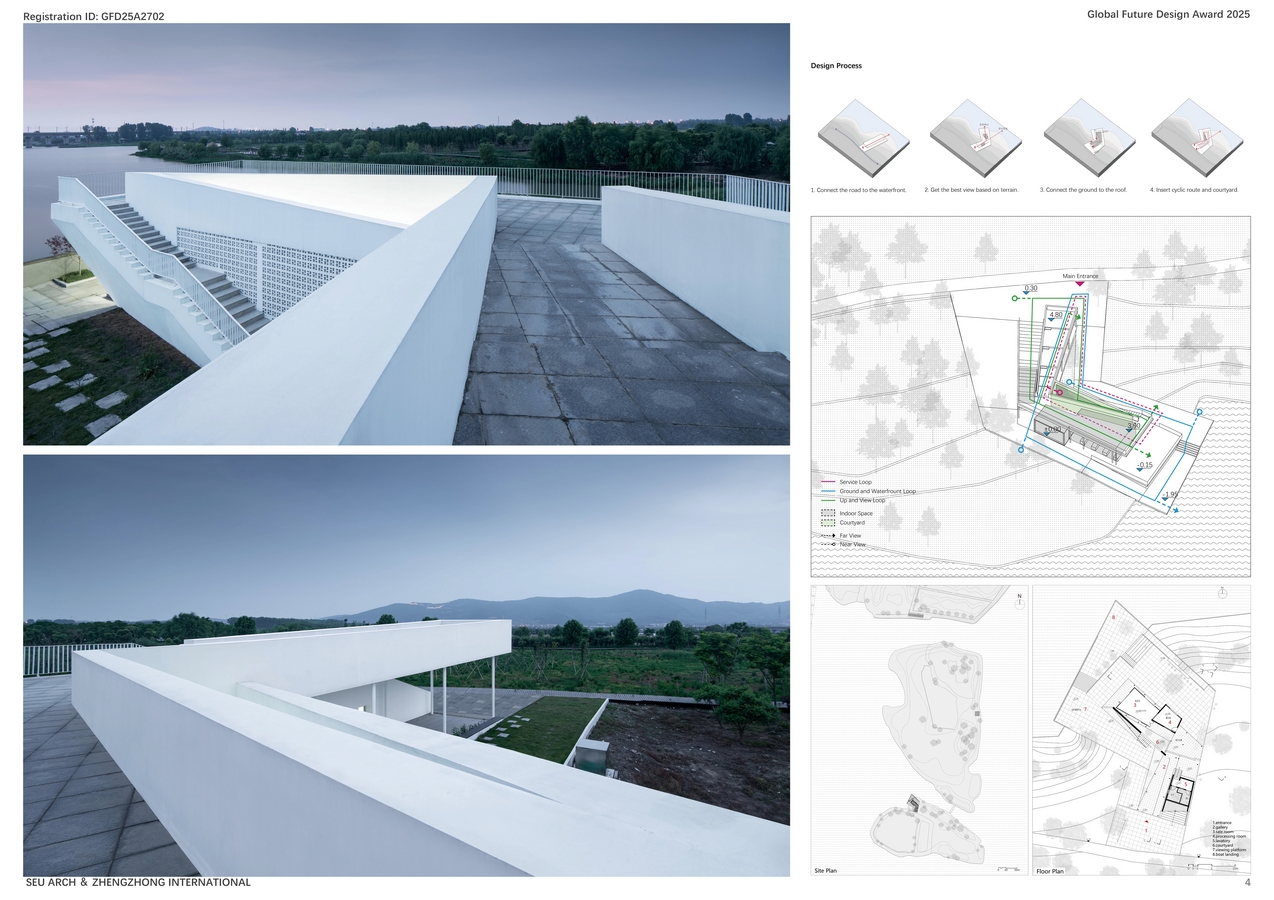 Through the setting of a cyclic route, the architecture creates a perception of space switching between inside and outside, up and down, far and near. This three-dimensional cyclic system not only connects the space of the ground floor, courtyard, roof platform, and waterfront space, but also closely links the functions of retail, recreation, viewing, and boat landing.