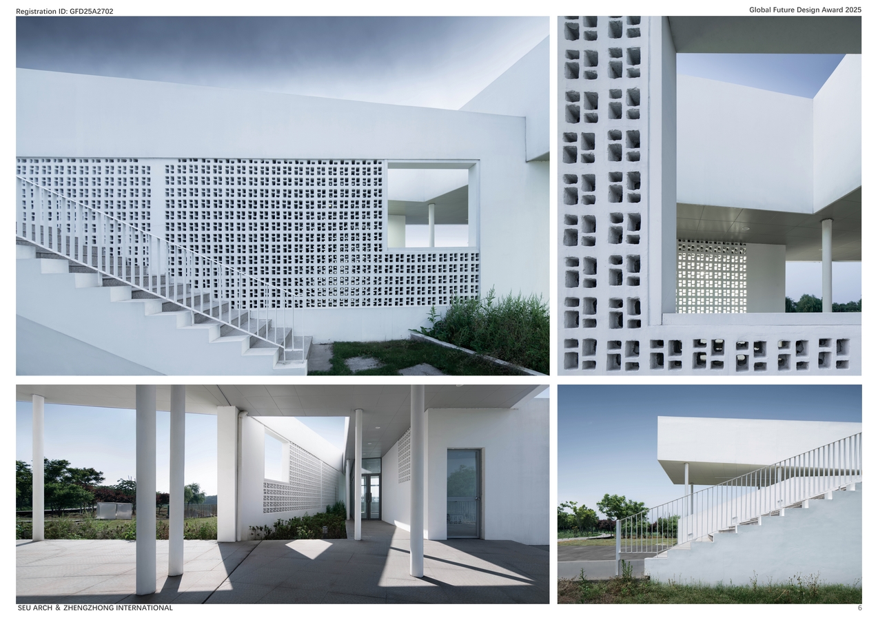 It is easy to find that the continuous hollowed steel handrail leads people to step from the ground to the air, while making people easily look through from inside to outside while walking along the cyclic route. The folding of the handrail creates the inner triangular courtyard, constructed of the local material of hollow bricks. thus, at the same time creates a kind of spatial depth between internal and external with the different heights and distances of view.