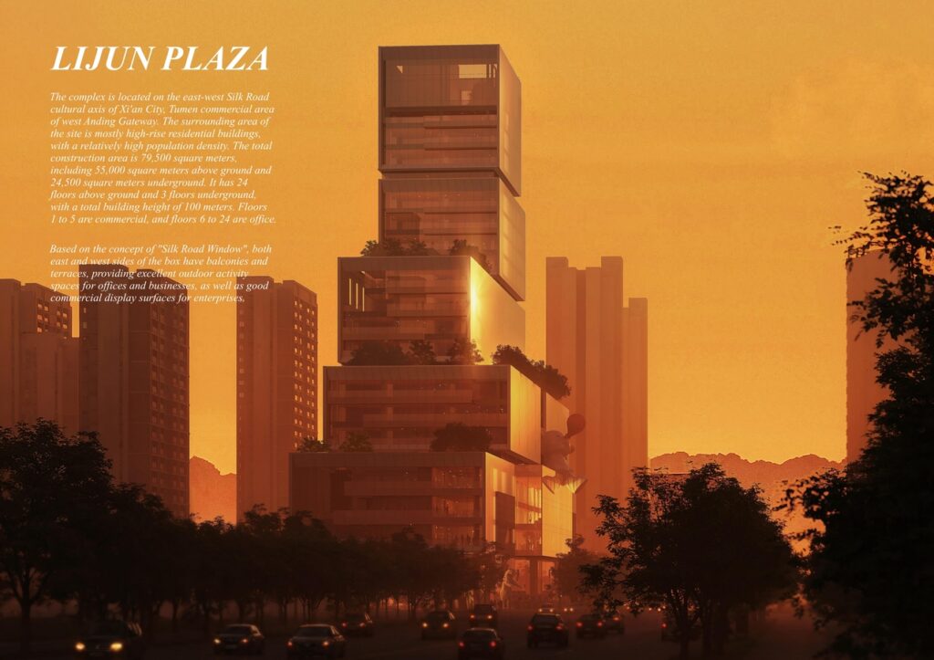 The commercial section is designed with the concept of an aerial market, creating a new landmark in the west of Xi ‘an City. It continues the traditional atmosphere of marketplace and infuses the city with more refined and lively charm. The design makes it possible for traditional malls and commercial streets to coexist in a whole volume. One is for the 12-hour operation of retail malls during the daytime. Another bossiness type is for residential areas nearby, including restaurants, bars, tea houses, etc., advocating a 24-hour lifestyle. LIJUN PLAZA integrates commerce and social interaction, and its diversified usage scenarios blur the sense of boundary between indoor and outdoor spaces. The office section offers multiple possibilities for space division and provides large outdoor terraces and balconies, introducing the concept of green office into the design. According to the size of different boxes, functions such as the pharmaceutical trading center, hotel, Lijun headquarters office, and high-end rental office are distributed within each box. The overall facade style is simple and modern in combination with the volume. Dark glass and white vertical blinds are used as the basic design elements. The concept of the Silk Road Window is vividly reflected by the use of colored glazed glass and lighting design at the window. After its completion, the project is bound to become a shining pearl on the Xi ‘an Silk Road Cultural Axis.