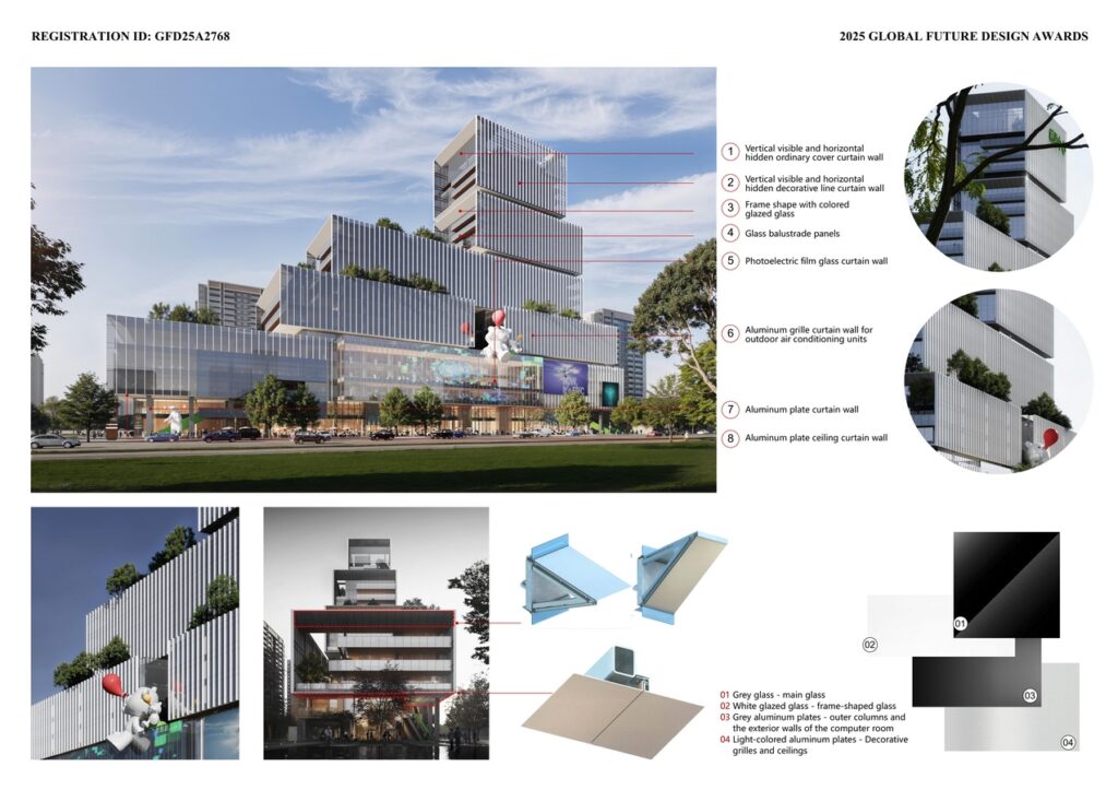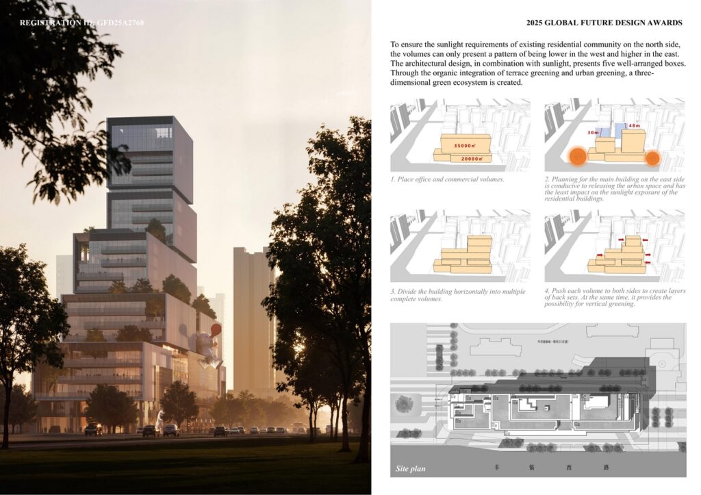 To ensure the sunlight requirements of existing residential community on the north side, the volumes can only present a pattern of being lower in the west and higher in the east. The architectural design, in combination with sunlight, presents five well-arranged boxes. Through the organic integration of terrace greening and urban greening, a three-dimensional green ecosystem is created. Based on the concept of “Silk Road Window”, both east and west sides of the box have balconies and terraces, providing excellent outdoor activity spaces for offices and businesses, as well as good commercial display surfaces for enterprises.