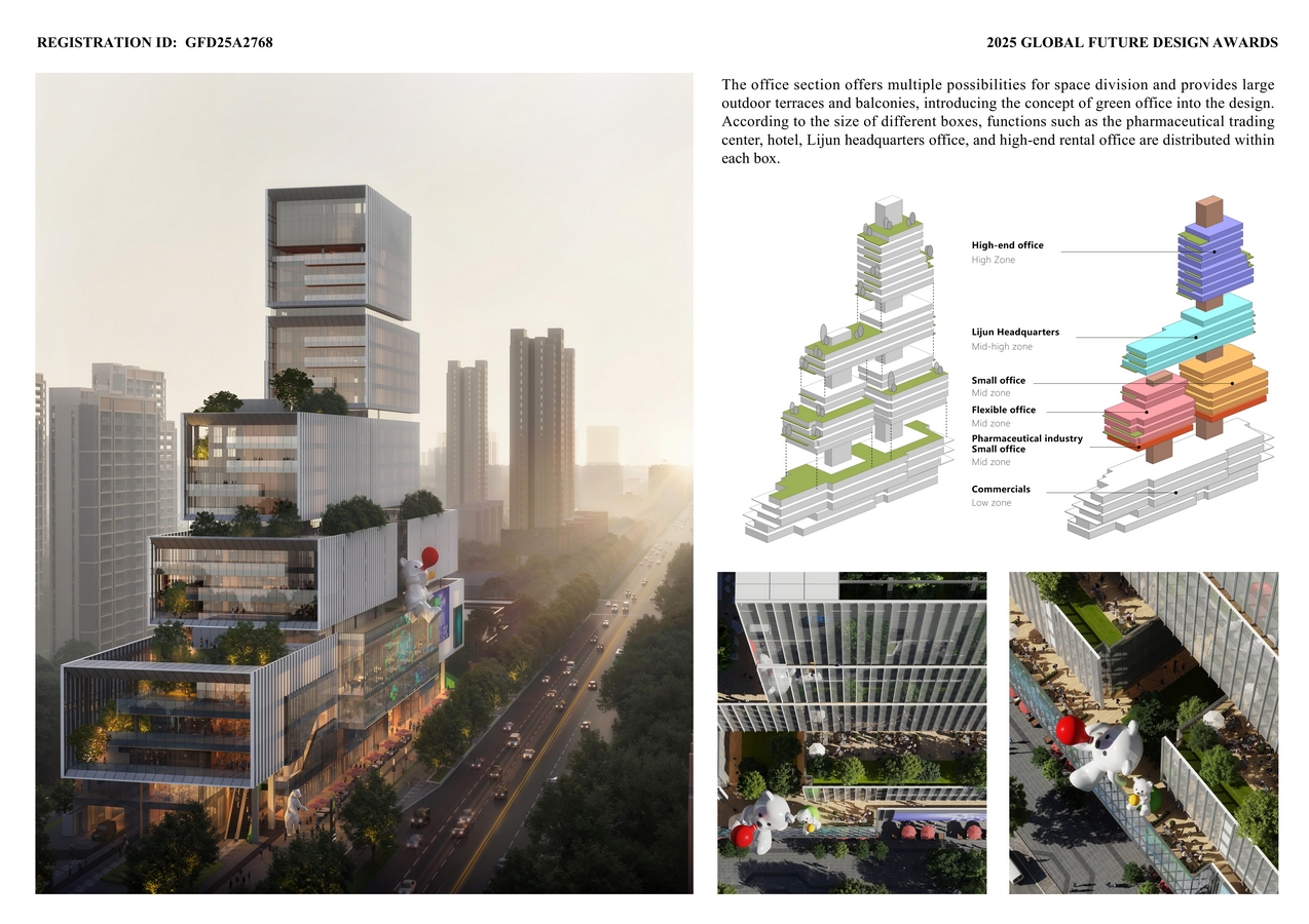 To ensure the sunlight requirements of existing residential community on the north side, the volumes can only present a pattern of being lower in the west and higher in the east. The architectural design, in combination with sunlight, presents five well-arranged boxes. Through the organic integration of terrace greening and urban greening, a three-dimensional green ecosystem is created. Based on the concept of “Silk Road Window”, both east and west sides of the box have balconies and terraces, providing excellent outdoor activity spaces for offices and businesses, as well as good commercial display surfaces for enterprises.