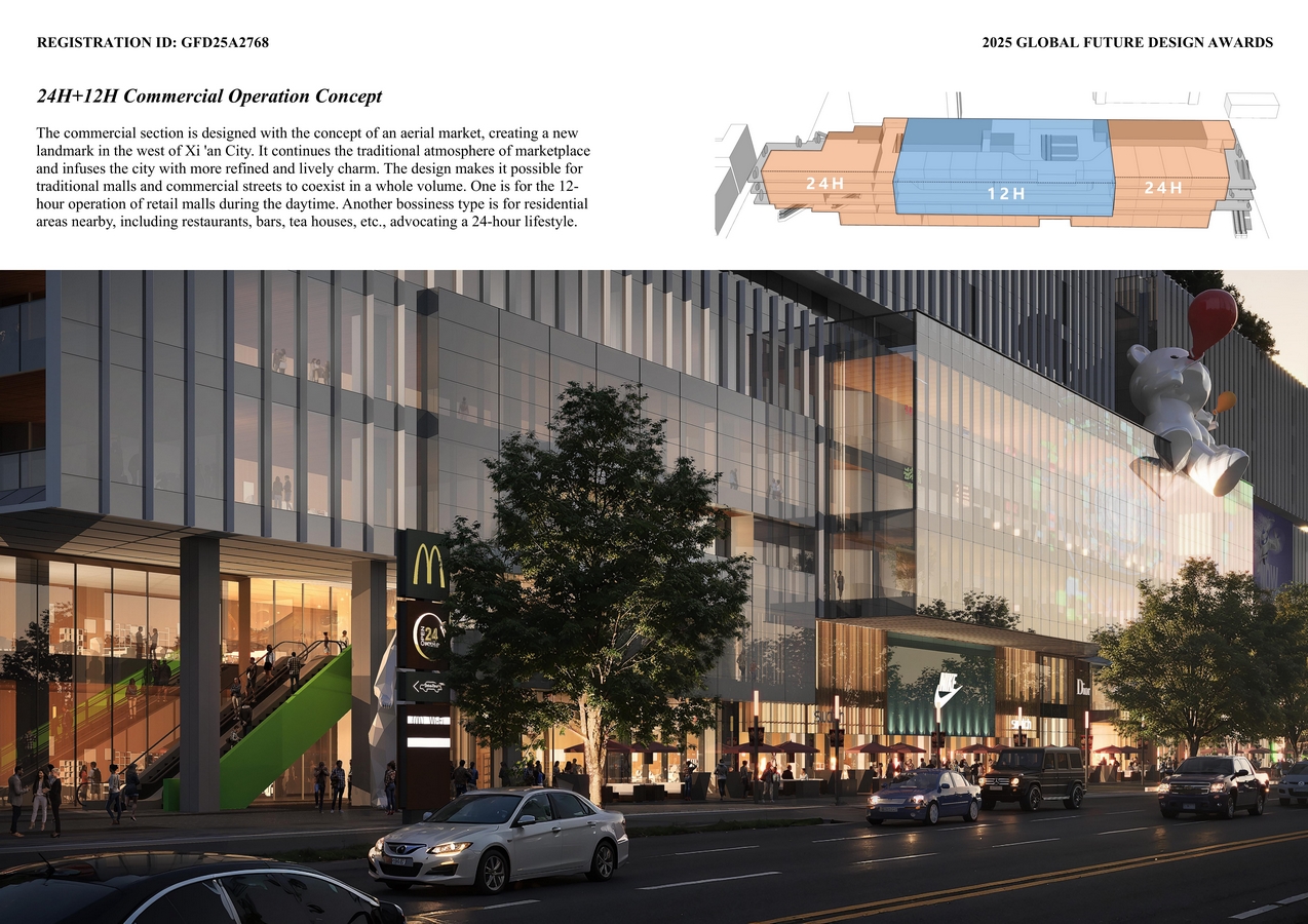 The commercial section is designed with the concept of an aerial market, creating a new landmark in the west of Xi ‘an City. It continues the traditional atmosphere of marketplace and infuses the city with more refined and lively charm. The design makes it possible for traditional malls and commercial streets to coexist in a whole volume. One is for the 12-hour operation of retail malls during the daytime. Another bossiness type is for residential areas nearby, including restaurants, bars, tea houses, etc., advocating a 24-hour lifestyle. LIJUN PLAZA integrates commerce and social interaction, and its diversified usage scenarios blur the sense of boundary between indoor and outdoor spaces. The office section offers multiple possibilities for space division and provides large outdoor terraces and balconies, introducing the concept of green office into the design. According to the size of different boxes, functions such as the pharmaceutical trading center, hotel, Lijun headquarters office, and high-end rental office are distributed within each box. The overall facade style is simple and modern in combination with the volume. Dark glass and white vertical blinds are used as the basic design elements. The concept of the Silk Road Window is vividly reflected by the use of colored glazed glass and lighting design at the window. After its completion, the project is bound to become a shining pearl on the Xi ‘an Silk Road Cultural Axis.