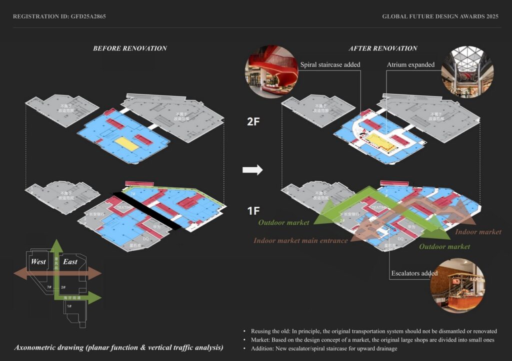 The Dongfang Market reconfigures spatial circulation with the concept of “MAKE MARKET”. Anchored by the East Market and complemented by the West Market, it creates a continuous indoor marketplace. Originally fragmented streets of varying styles have been unified into a flexible and adaptable market environment, achieving a symbiotic evolution between the traditional bazaar and contemporary commercial aesthetics. The East and West Markets are linked by an outdoor harbor-style street, embedding themed indoor bazaars and forming a three-tiered spatial structure of “core market—outdoor market—extended market”.