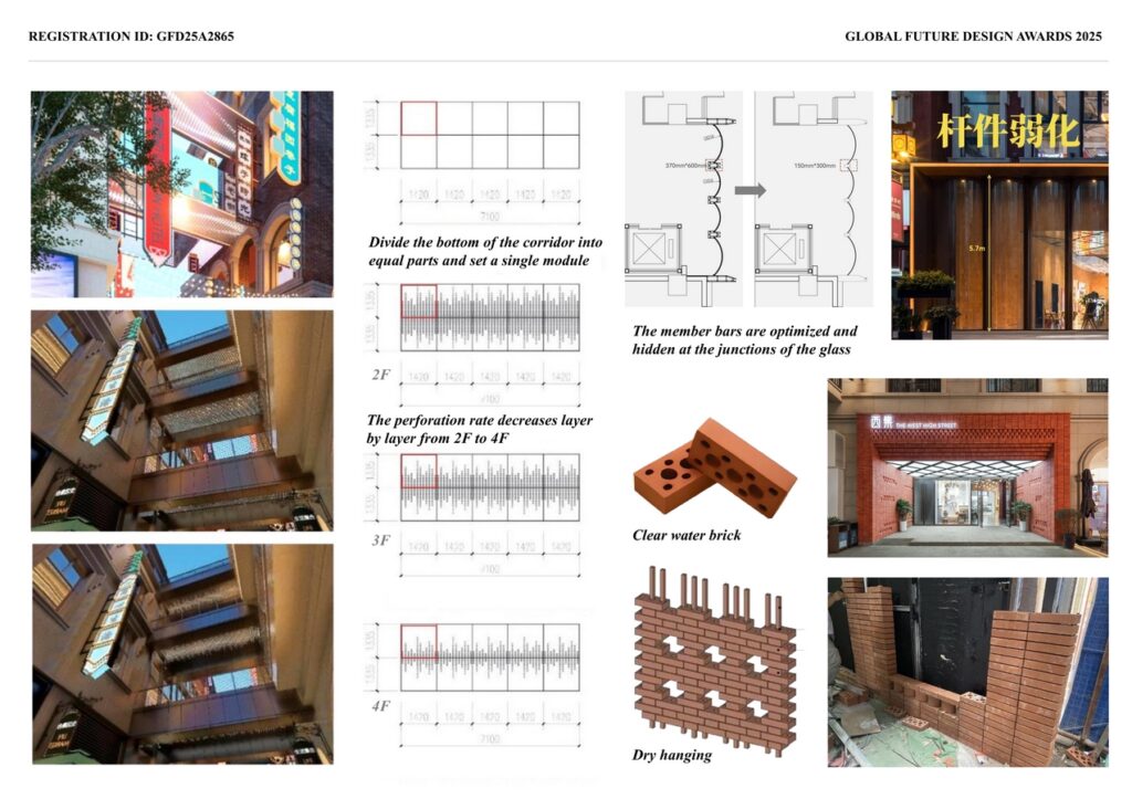 The façade design adopts a strategy of “light intervention, strong revitalization”. Against the backdrop of economic slowdown and consumer downgrading, the core principle of “preserving the skin while changing the core” is applied—retaining the historical texture of building exteriors while focusing renovation efforts on reprogramming interior spaces and upgrading experiential scenes. Through subtle modifications at key spatial nodes and reinterpretation of local cultural elements, everyday motifs such as red lanterns and red bricks are transformed into design features. Combined with commercial scene-making, this creates a time–space interface where the texture of traditional urban life coexists with the aesthetics of modern commerce. The Dongfang Market introduces an expansive red-brick commercial language, extending from interior walls to the building façade, creating a consistent indoor-outdoor material expression. On this unified basis, practical requirements such as insulation and waterproofing are fulfilled, while red bricks are also used to form distinctive landscape walls and custom planters, producing a style that is both unique and seamlessly integrated with the architecture. Curved glass, designed as the signature frontage of the Dongfang Market, takes inspiration from the motif of lanterns. It emphasizes the warmth and vibrancy of daily life, fusing visual impact with the functional need for spatial transparency. Standardized curved glass units are employed to reduce the cost of irregular components, while the outer frame is finished in warm copper-toned stainless steel, creating a material dialogue with red brick and reinforcing an aesthetic tension between history and modernity.