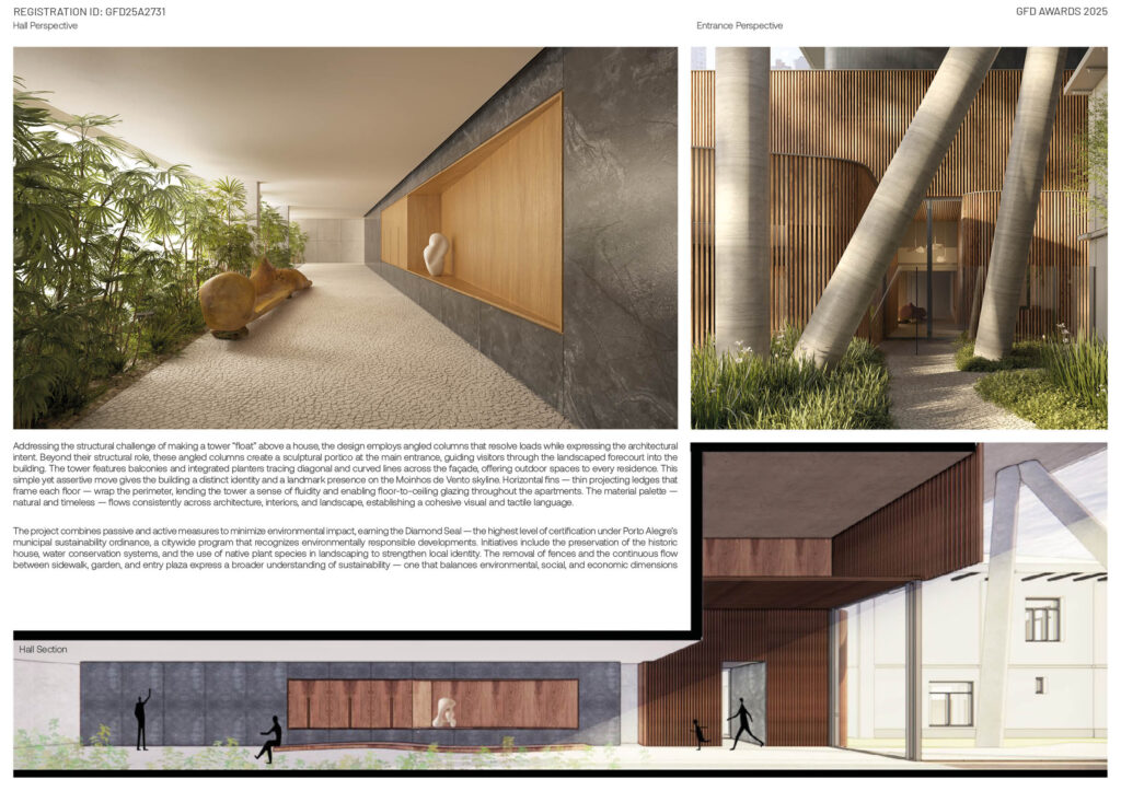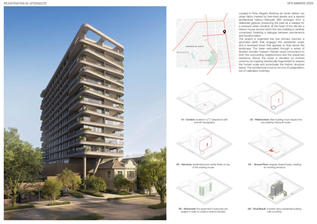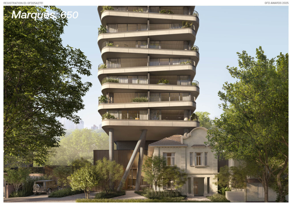 Located in Porto Alegre’s Moinhos de Vento district—an urban fabric marked by tree-lined streets and layered architectural history—Marquês 650 emerges as an urban intervention that intertwines memory and contemporaneity. At the heart of the site stands a preserved historic house, not treated as a relic but as a catalyst for the project’s narrative. Around this element, the new building is carefully composed, fostering a dialogue between permanence and transformation that becomes central to its identity.