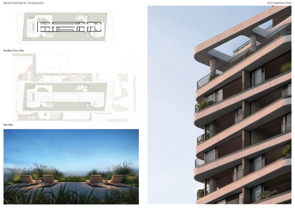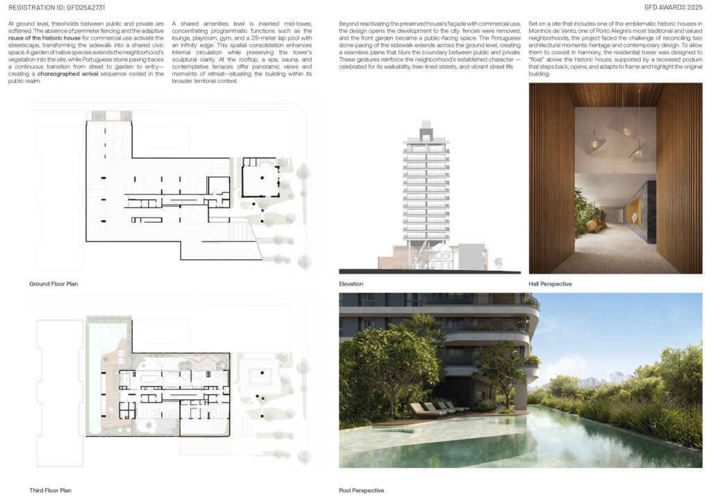 Programmatically, the building introduces moments of collective experience strategically within its vertical organization. A shared amenities level—inserted mid-tower—concentrates uses such as lounge, playroom, gym, and a 25-meter lap pool with an infinity edge. This consolidation preserves the tower’s sculptural clarity while enhancing circulation and social interaction. At the rooftop, a spa, sauna, and contemplative terraces provide panoramic views of the city, situating the project not only within its immediate block but also within Porto Alegre’s broader territorial fabric.