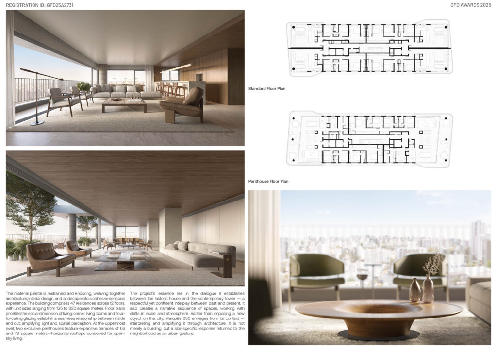 The material palette is restrained and enduring, weaving architecture, interior design, and landscape into a cohesive sensorial experience. Wood, stone, and glass are deployed with precision, creating a tactile continuity between exterior and interior spaces. In total, the building houses 47 residences across 12 floors, with unit sizes ranging from 135 to 330 square meters. Floor plans emphasize the social dimension of living: corner living rooms and floor-to-ceiling glazing establish seamless connections with the outside, amplifying light and perception of space. At the uppermost level, two penthouses crown the tower with expansive terraces of 66 and 73 square meters—horizontal rooftops conceived for open-sky living. Marquês 650 is certified at the Diamond level by Porto Alegre’s Environmental Sustainability Program. Strategies such as cross ventilation, generous daylighting, and the rehabilitation of the existing structure are not add-ons but integral to the architectural conception. The result is a framework of longevity and performance that privileges both environmental responsibility and spatial quality. More than an object imposed on its surroundings, Marquês 650 is a site-specific response—interpreting, amplifying, and returning the neighborhood’s character as an urban gesture.