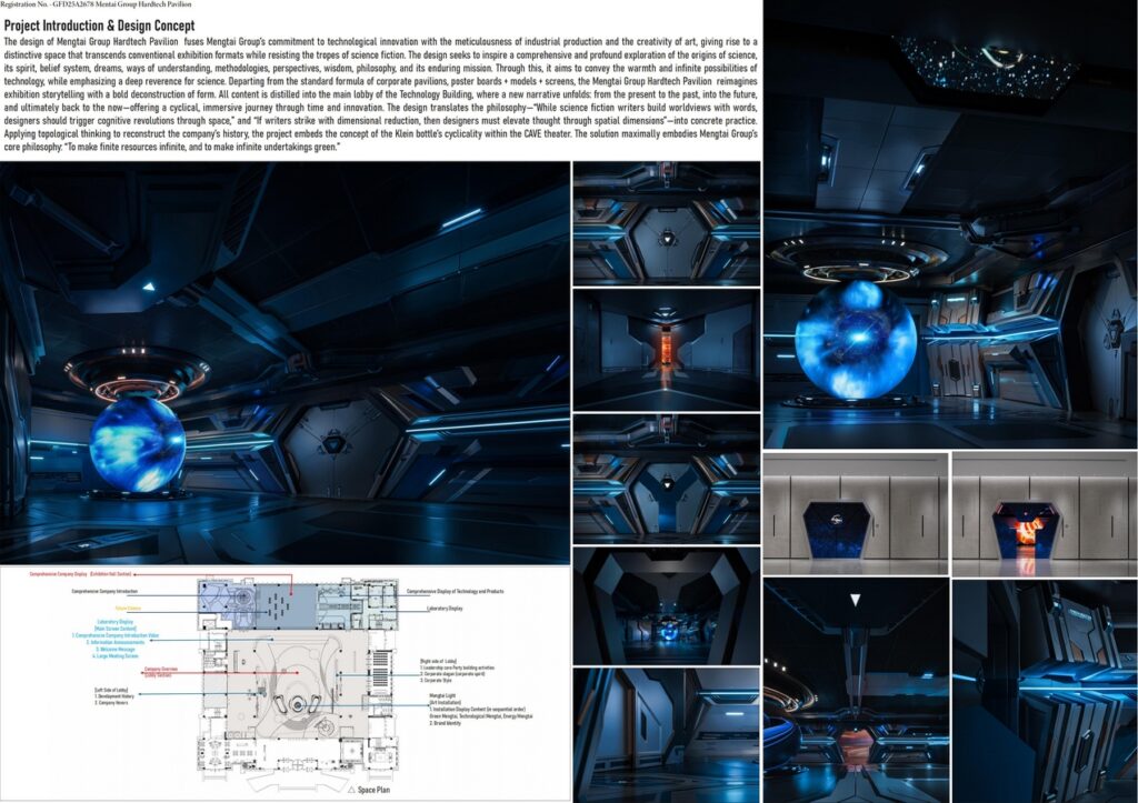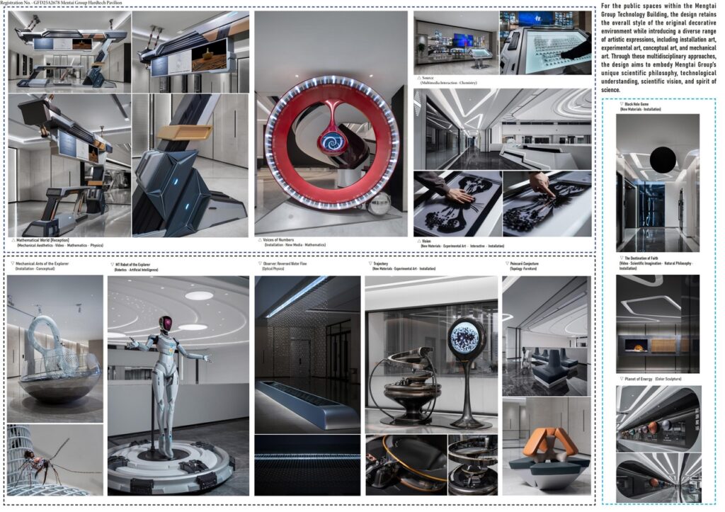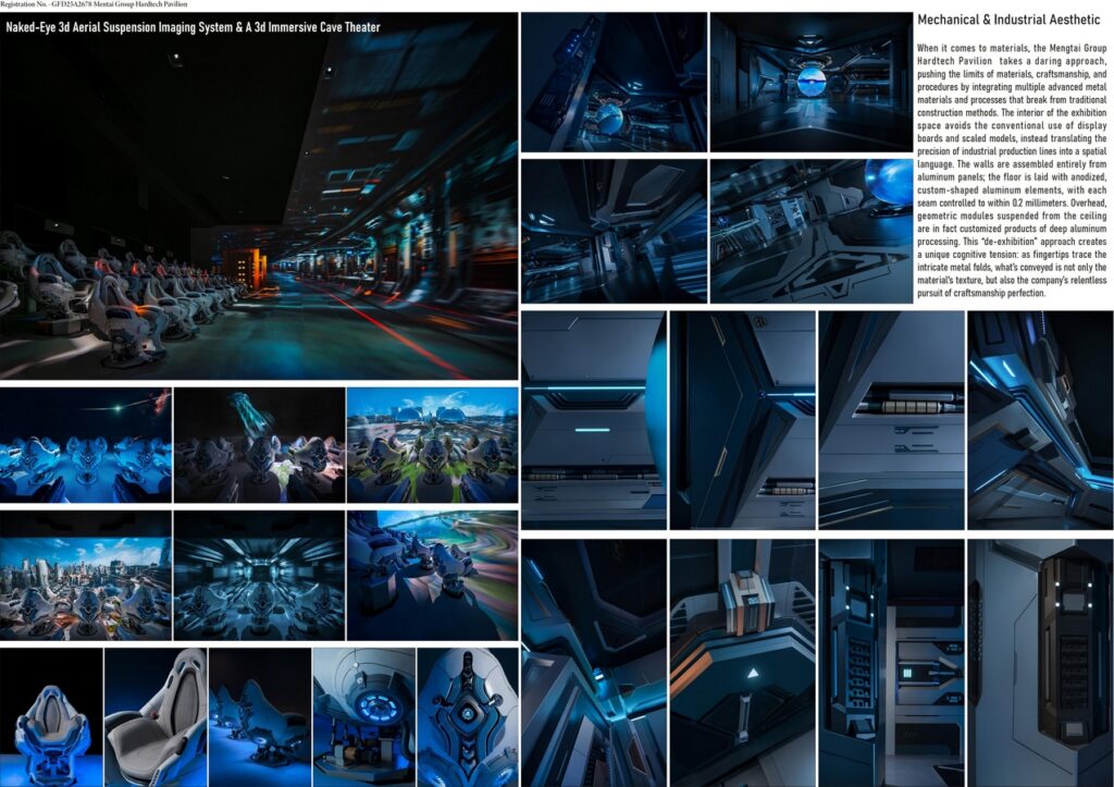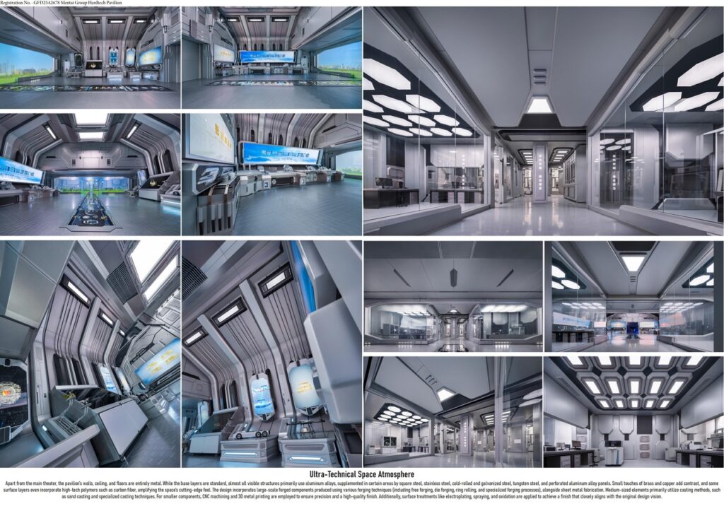 When it comes to materials, the Mengtai Group Hardtech Pavilion takes a daring approach, pushing the limits of materials, craftsmanship, and procedures by integrating multiple advanced metal materials and processes that break from traditional construction methods. Apart from the main theater, the pavilion’s walls, ceiling, and floors are entirely metal. While the base layers are standard, almost all visible structures primarily use aluminum alloys, supplemented in certain areas by square steel, stainless steel, cold-rolled and galvanized steel, tungsten steel, and perforated aluminum alloy panels. Small touches of brass and copper add contrast, and some surface layers even incorporate high-tech polymers such as carbon fiber, amplifying the space’s cutting-edge feel. The design incorporates large-scale forged components produced using various forging techniques (including free forging, die forging, ring rolling, and specialized forging processes), alongside sheet metal fabrication. Medium-sized elements primarily utilize casting methods, such as sand casting and specialized casting techniques. For smaller components, CNC machining and 3D metal printing are employed to ensure precision and a high-quality finish. Additionally, surface treatments like electroplating, spraying, and oxidation are applied to achieve a finish that closely aligns with the original design vision. Mengtai Pavilion reconstructs the foundational logic of exhibition design by transforming from a simple “container for information display” into a “cognitive operating system,” while moving beyond a traditional showcase of technological accomplishments toward an experimental arena for science ethics. Formed amid fears of the normalized present and uncertainties of future progress, it unsettles conventional experiences to foster a new aesthetic phenomenon. The pavilion’s commitment to moral beauty embodies a destructive aesthetic ideal, inviting reflection on sustainable aesthetics and the pursuit of future innovation and constant breakthroughs.
