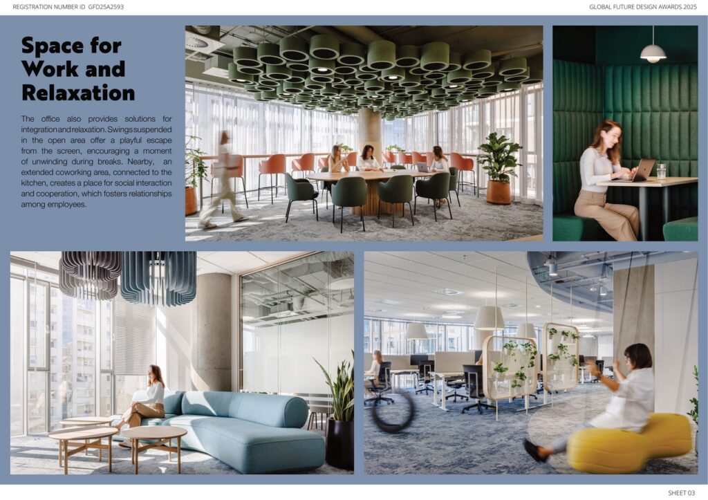 The office also provides solutions for integration and relaxation. Swings suspended in the open area offer a playful escape from the screen, encouraging a moment of unwinding during breaks. Nearby, an extended coworking area, connected to the kitchen, creates a place for social interaction and cooperation, which fosters relationships among employees.