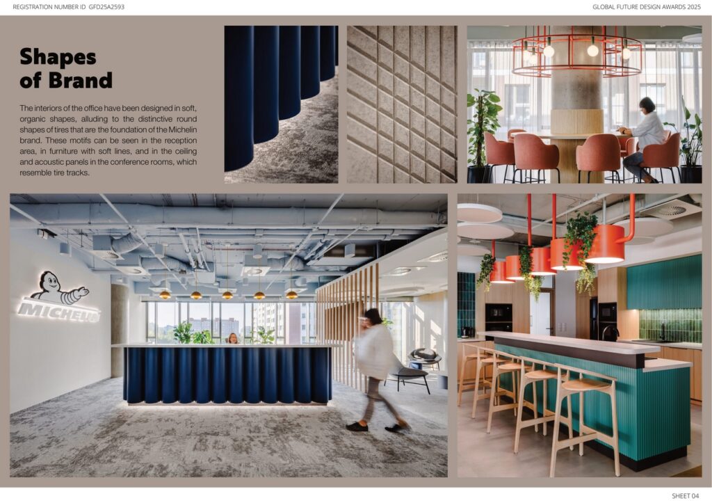 The interiors of the office have been designed in soft, organic shapes, alluding to the distinctive round shapes of tires that are the foundation of the Michelin brand. These motifs can be seen in the reception area, in furniture with soft lines, and in the ceiling and acoustic panels in the conference rooms, which resemble tire tracks.