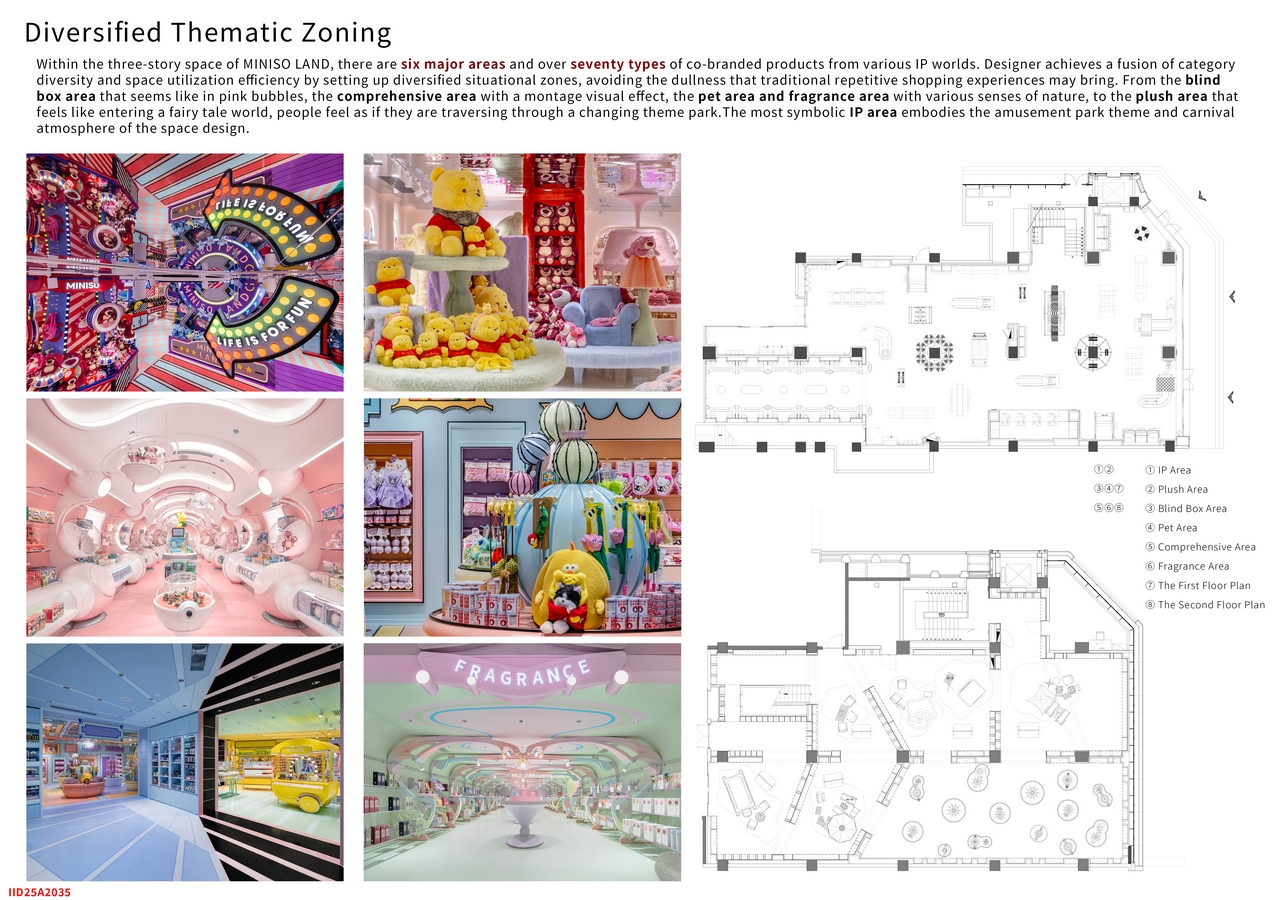 Upon entering, visitors are immersed in a narrative-driven retail environment where functional spaces are reimagined as thematic attractions. On the first floor, IP area, animated by vibrant hues and modular toy-inspired shelving, mimics a carnival atmosphere. The designer translates the interspersed combination form of assembly toys into the shelf structure logic, using objects to imitate objects, weakening the utilitarian identity of traditional shelves, re-establishing people’s emotional connections and value perceptions of products. The blind box area gently lifts people’s joyful mood in the amusement park with a dreamy, empty pink color, placing soft bubbles to fill the entire space.