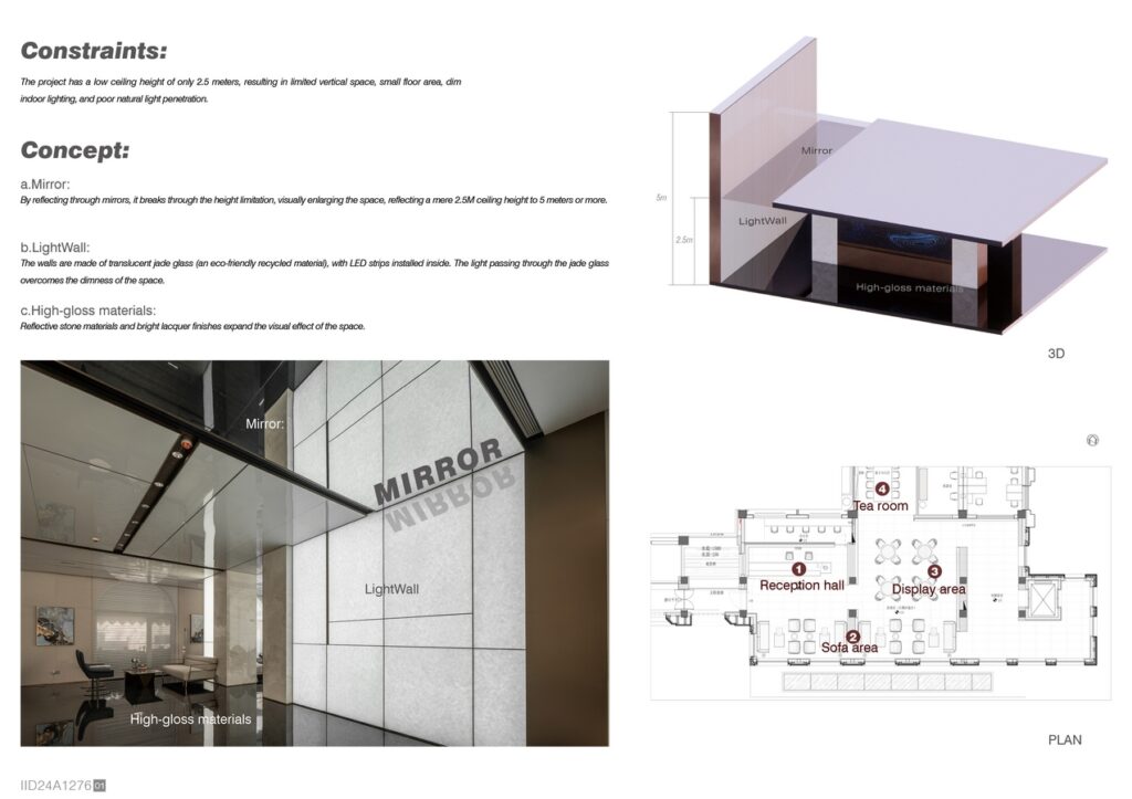 The project has a low ceiling height of only 2.5 meters, resulting in limited vertical space, small floor area, dim indoor lighting, and poor natural light penetration.