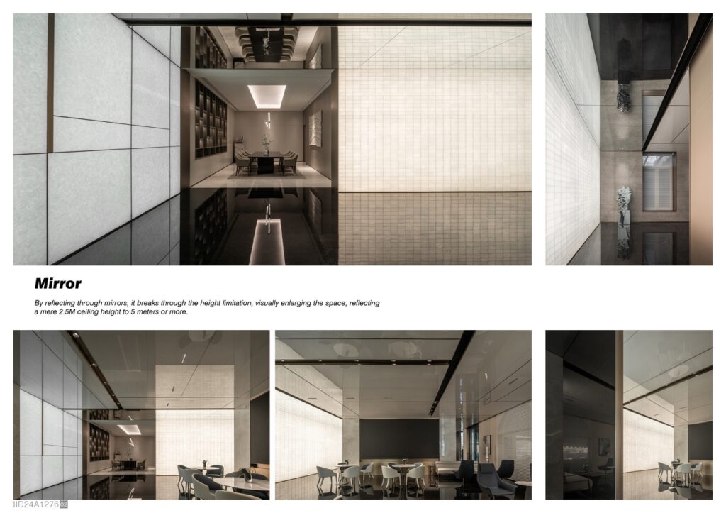 By strategically placing mirrored materials throughout the space, they can reflect and extend the actual 2.5-meter ceiling height to appear as if it is 5 meters or even higher, greatly expanding the space’s height visually. This makes the entire space look much more open.