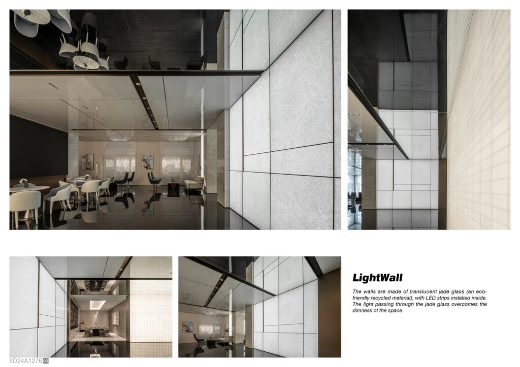 The walls are made of translucent jade glass (an eco-friendly recycled material), with LED strips installed inside. The light passing through the jade glass overcomes the dimness of the space.