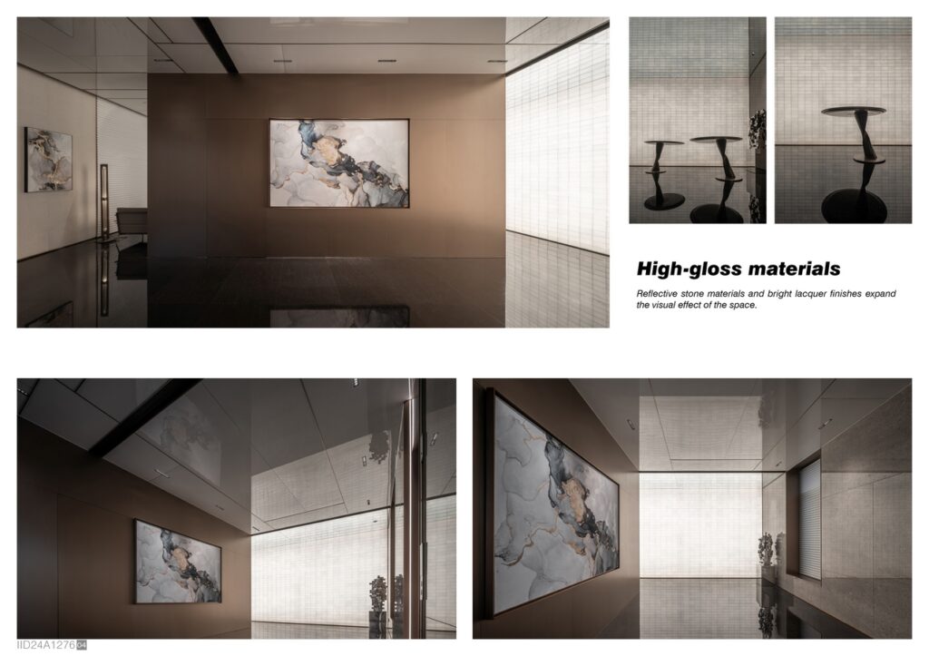 Reflective stone materials and bright lacquer finishes expand the visual effect of the space.