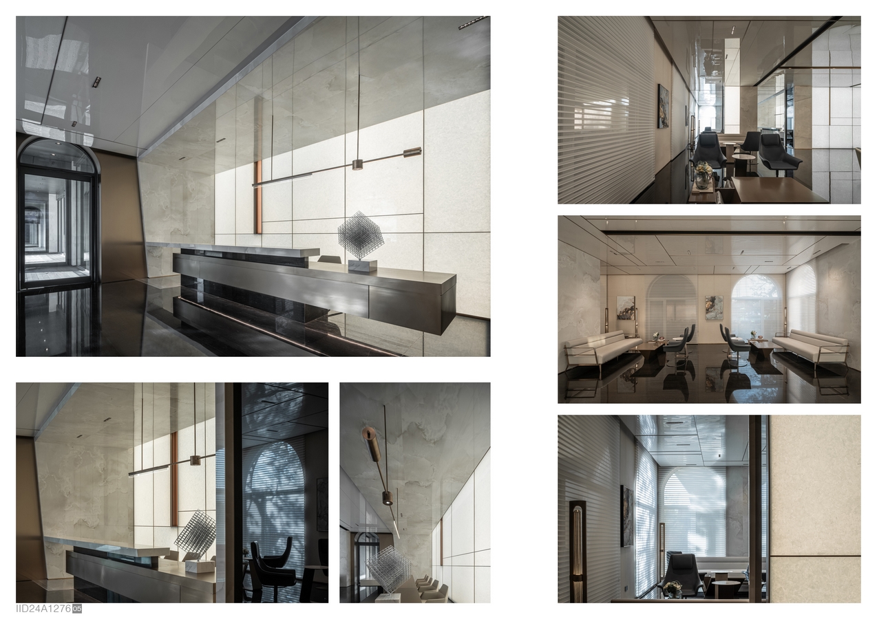 Utilizing large-sized, lightweight, fusion, and recyclable Dekton Slim jade stone panels for ceiling and wall decoration, achieving seamless integration between the walls and ceilings, enhancing aesthetic appeal, and expanding the visual perception of space.