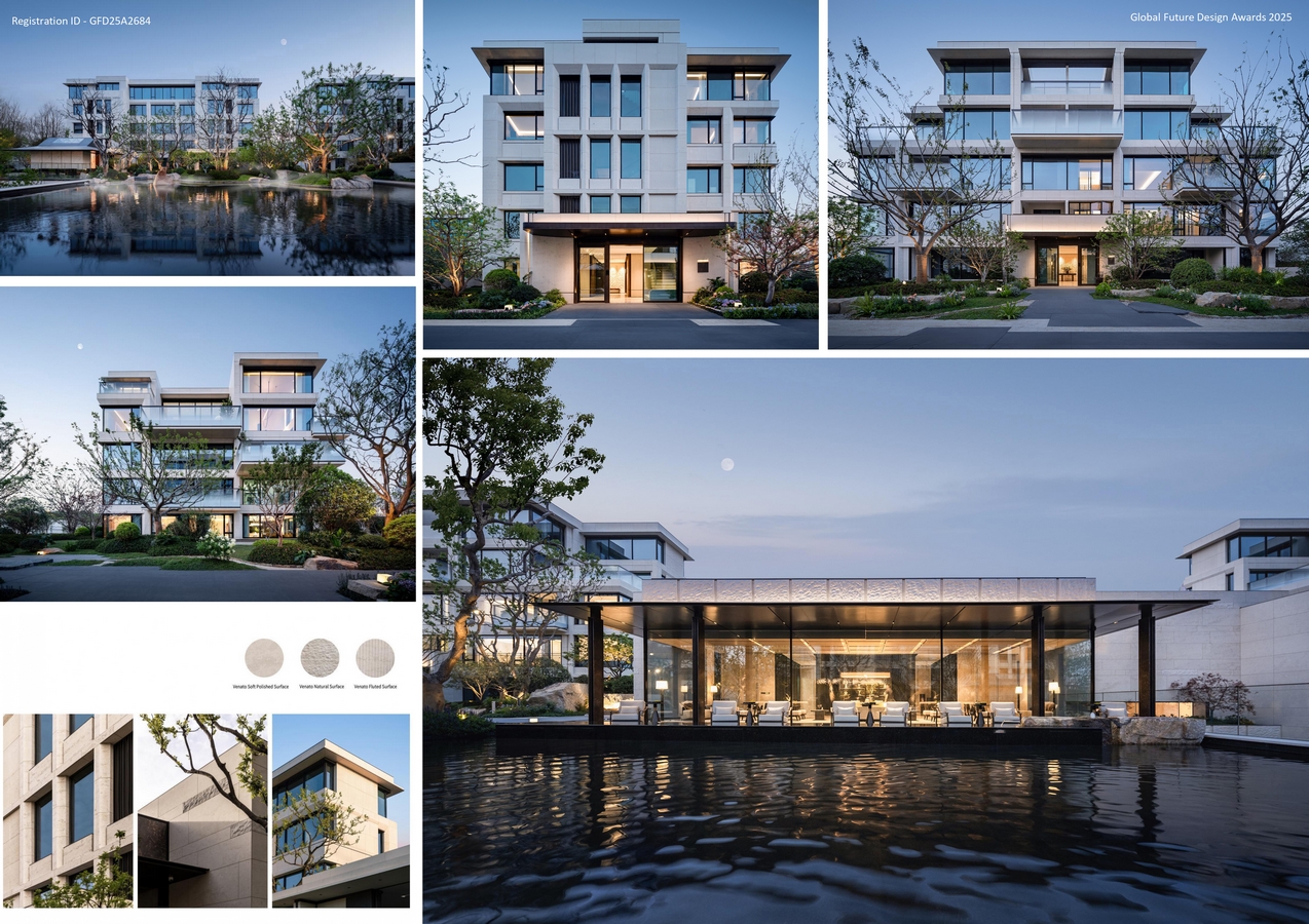 The residential design pays homage to Villa Savoye, prioritizing lifestyle through distinct configurations: top-level Sky Villas feature 270° panoramic floor-to-ceiling windows; mid-level Forest Residences incorporate private courtyard gardens; and ground-level Private Villas offer double-height subterranean spaces. Expansive cladding in softly luminous Venato Stone reveals restrained, deep textures under changing light conditions. Precision-crafted trimless window frames achieve minimalist elegance, while generously cantilevered terraces employ gradient-fritted glass, dissipating structural presence to create floating observatories framing Purple Mountain’s dawn and dusk vistas. Within the clubhouse, sculpted walls reconfigure spatial sequences, establishing deliberate contrasts of solid and void, mass and lightness. These flowing walls integrate seamlessly with rooftop greenery, enhancing the presentation of the fifth elevation. The material palette extends the residences’ refined elegance, accented with gilded metal panels and natural-finish Venato Stone. Meticulous detailing throughout achieves a subtle equilibrium between technical precision and organic vitality.
