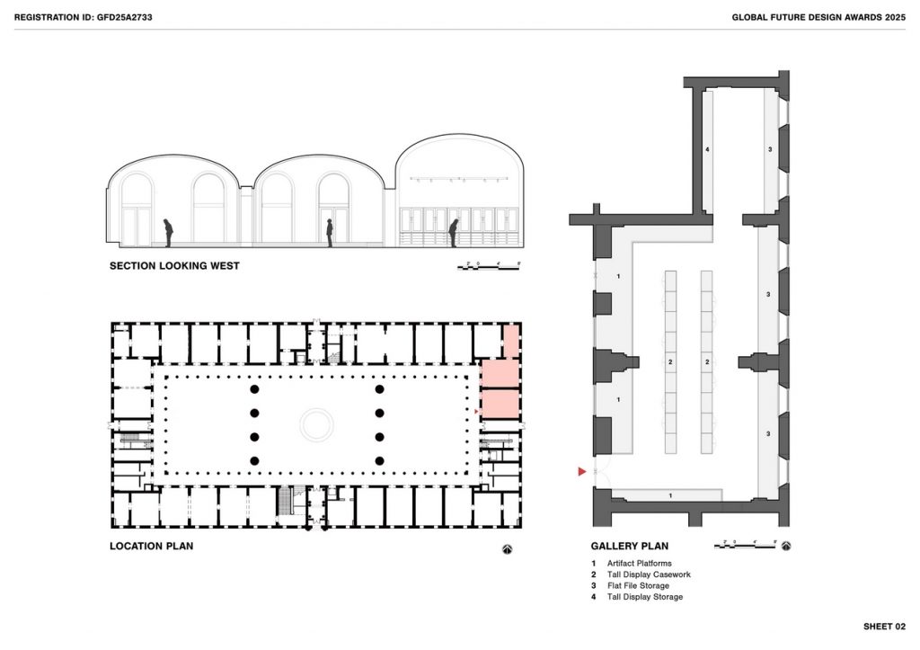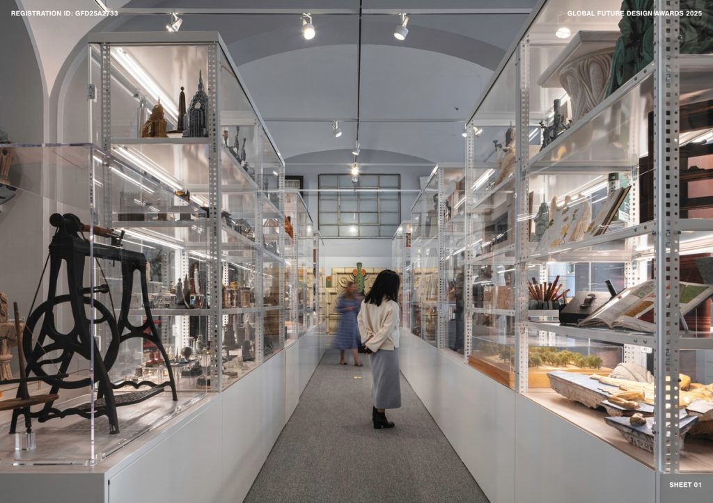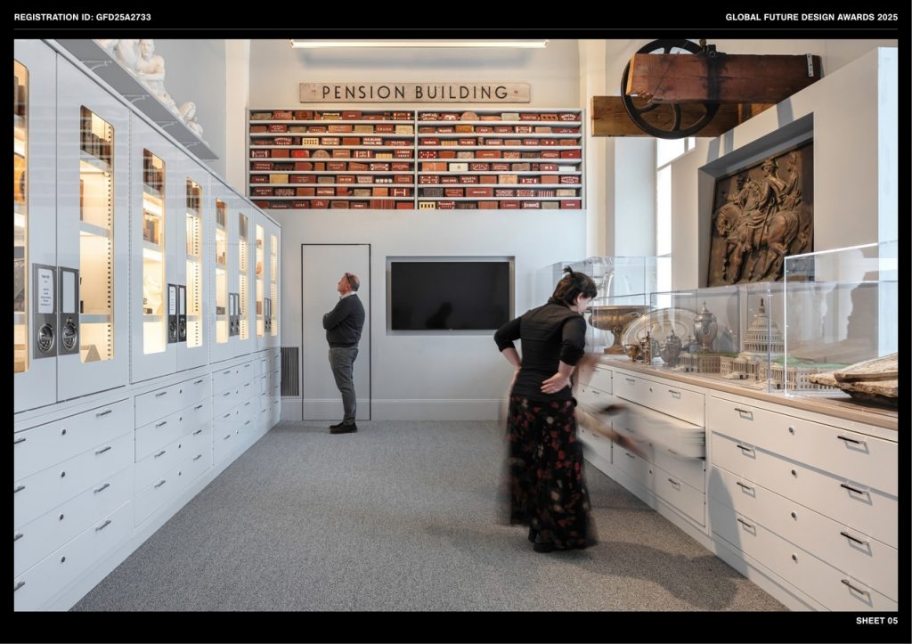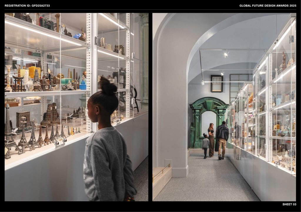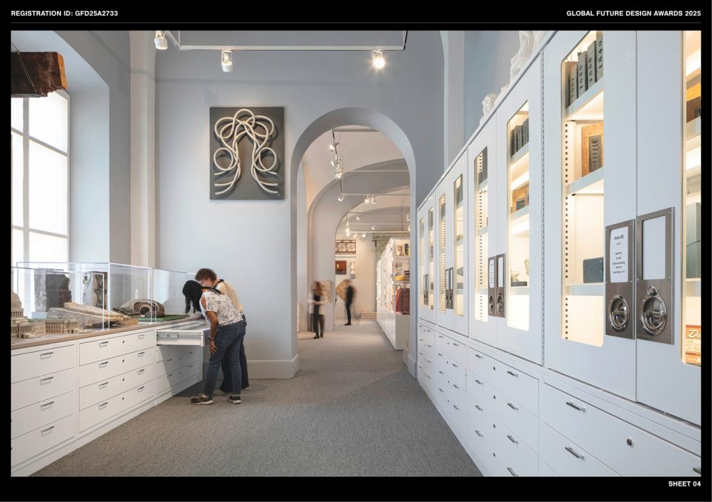 The layout maximizes display space, ensuring efficient and fully accessible circulation. Custom-designed vitrines were locally fabricated, offering greater transparency and flexibility at a lower cost than proprietary systems. They are easily adjusted for diverse, oversized, and heavy items. A white and gray palette serves as a neutral backdrop, enhancing the visibility of items on display on pedestals, in cases, or in drawers. The design features wood floors, safety rails, and enclosures with labels and graphics accommodating low-vision accessibility. Additional information is available through digital access points.