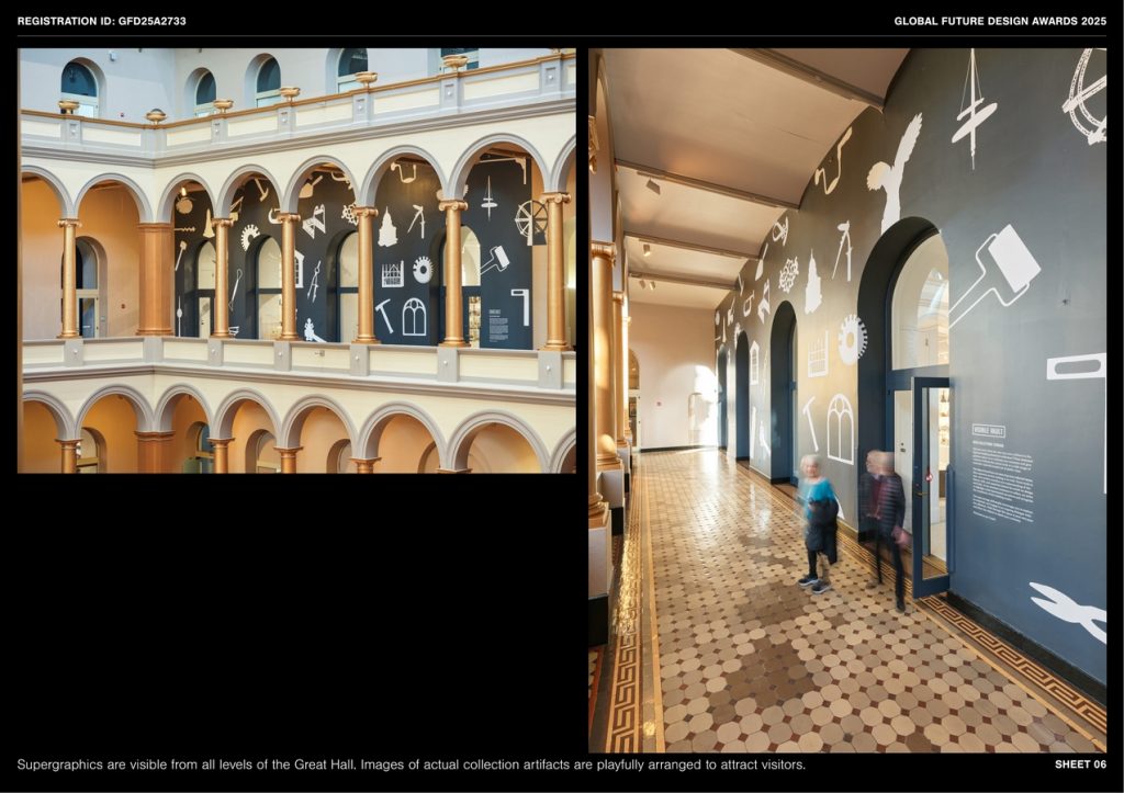 Outside the gallery, the dark gray wall has a playful environmental super graphic facing the Great Hall. This enhances the fun quality of the museum and overall wayfinding. The drawings are of elements on display.