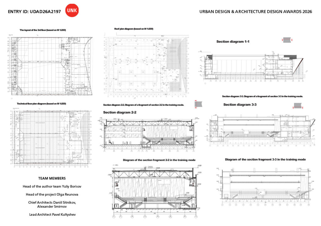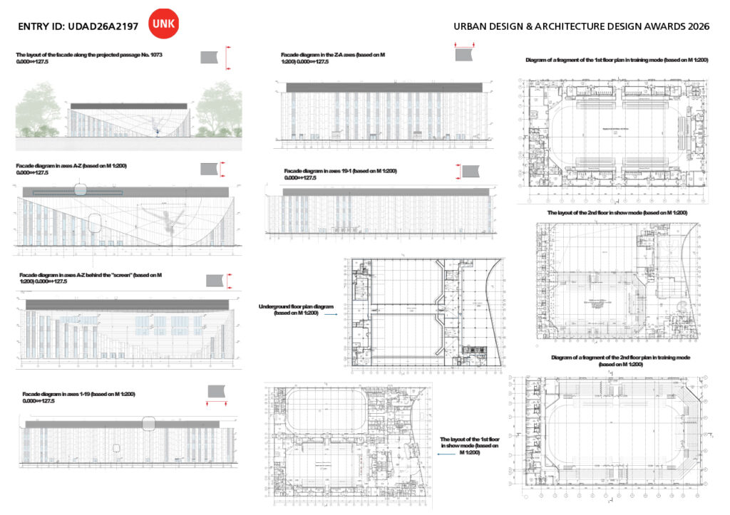 Special attention was paid to the main entrance, which is located directly in front of the subway exit, providing full visibility and convenient accessibility for visitors. To emphasize the hospitality and openness of the facility, we designed an “inviting” entrance, providing a modern portico where the facade curves smoothly inwards, forming an elegant parabola. The visor, set at an angle of approximately 35 degrees, adds dynamics and expressiveness to the composition, creating a clear and powerful parabolic line that can be seen from afar. This line symbolizes the tension and strength characteristic of athletes struggling with gravity on ice or in the air.
