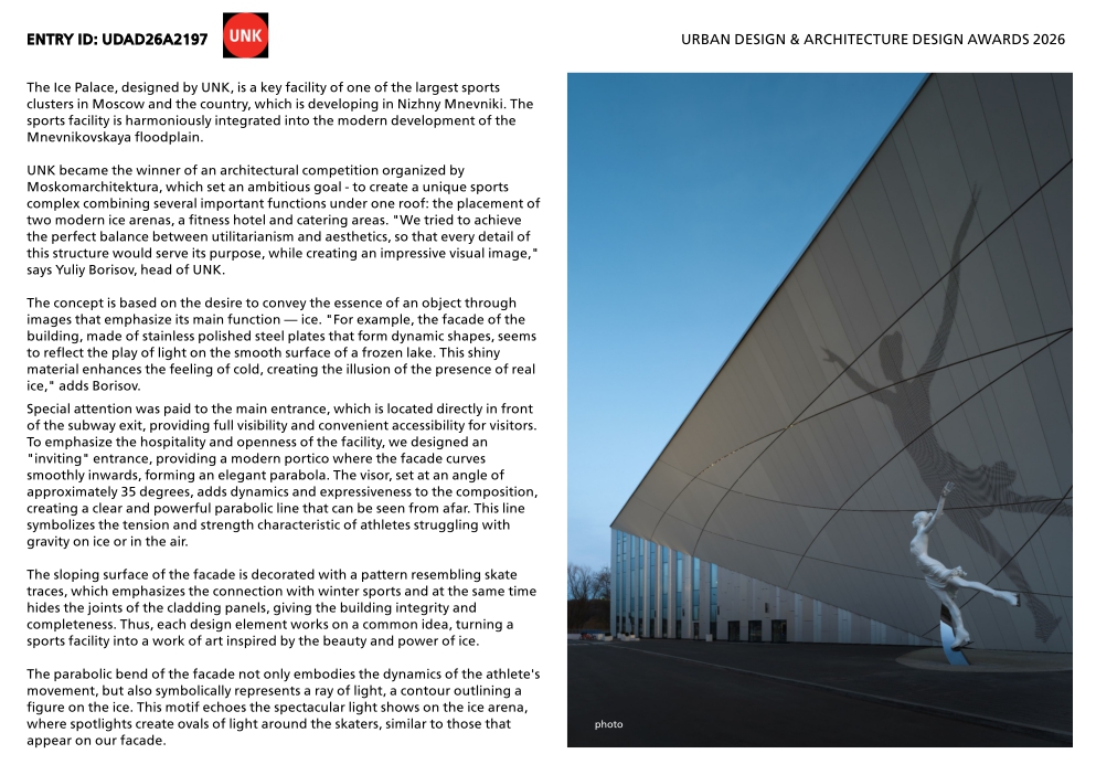 The Ice Palace, designed by UNK, is a key facility of one of the largest sports clusters in Moscow and the country, which is developing in Nizhny Mnevniki. The sports facility is harmoniously integrated into the modern development of the Mnevnikovskaya floodplain.