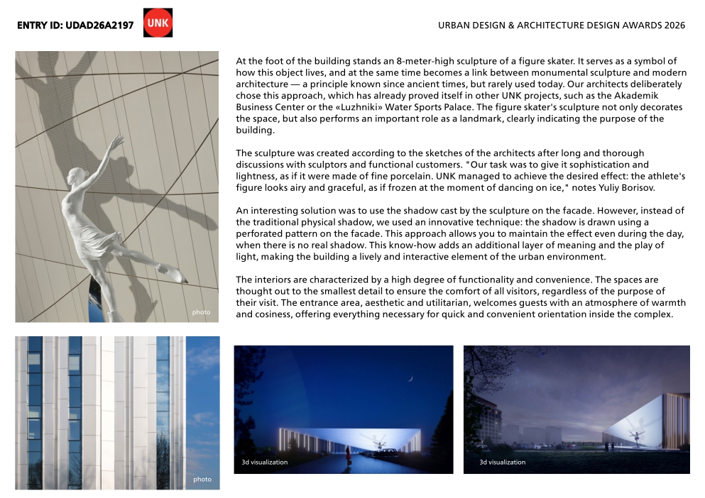 At the foot of the building stands an 8-meter-high sculpture of a figure skater. It serves as a symbol of how this object lives, and at the same time becomes a link between monumental sculpture and modern architecture — a principle known since ancient times, but rarely used today. Our architects deliberately chose this approach, which has already proved itself in other UNK projects, such as the Akademik Business Center or the «Luzhniki» Water Sports Palace. The figure skater’s sculpture not only decorates the space, but also performs an important role as a landmark, clearly indicating the purpose of the building.