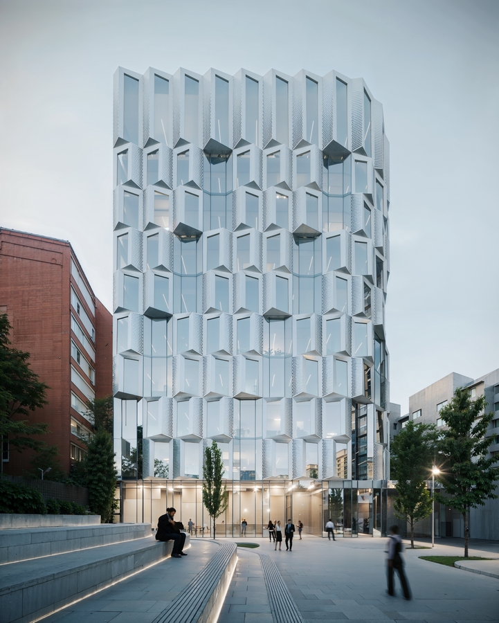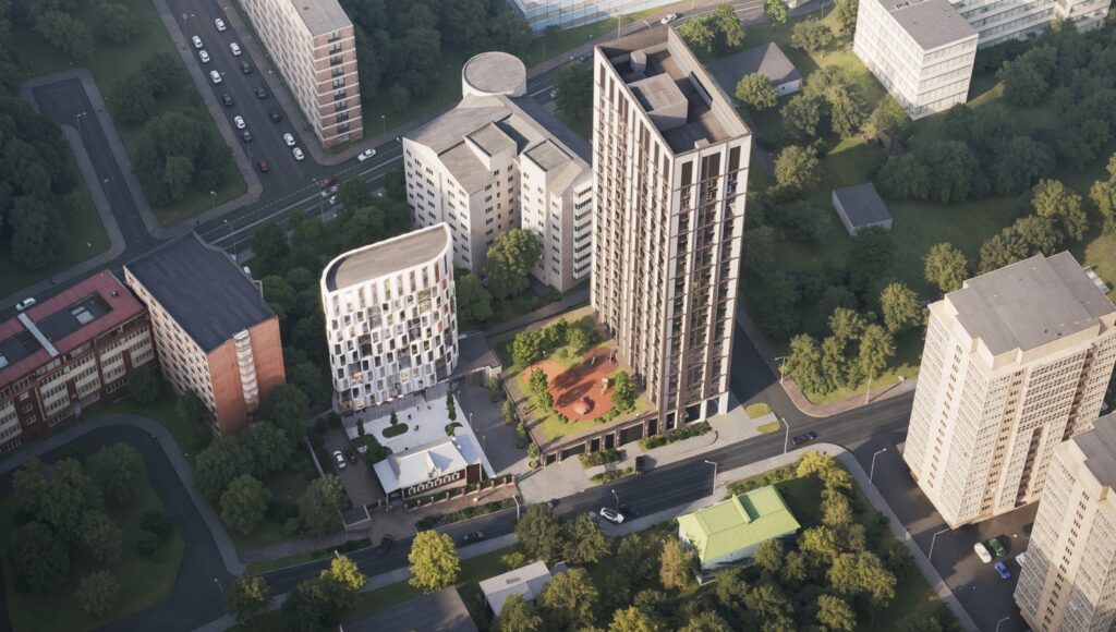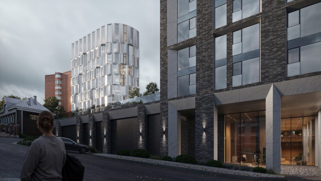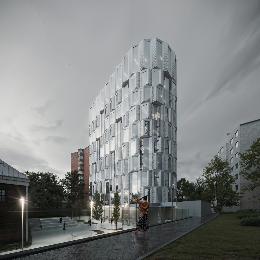 The location between a small-scale wooden mansion and a 25-story tower, the facades of which are planned to be made using limestone and clinker, had a strong influence on the compositional and architectural design of the office complex: the architects saw their task as using the new volume of the office building to visually unite the different era buildings into an integrated urban planning ensemble. Borisov Architects aspired to make the office building tactful from an urban planning point of view, but also independent and clearly visible in the city center skyline in regards to its plasticity and form. This is precisely why all the corners of the building under design are rounded and glass was chosen as the main facade material, however above the first floor all surfaces of the volume are not smooth, but rather assembled from dynamically rotated structural modules. Small areas of traditional glazing help to additionally emphasize their vivid plasticity – next to these voids, the patterns designed by the architects look even more expressive. It is also significant that the direction of the patterns changes depending on the floor, creating the look of a modern technological building. The side panels of each module are made of perforated metal – this not only adds additional interesting details to the appearance of the facades, but also made it possible to integrate hidden shutters into each window for ventilation. The top floor elements have an extended height. The parking area of the office complex is located on three underground levels and is fully mechanized.
