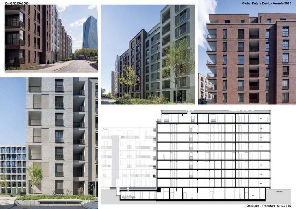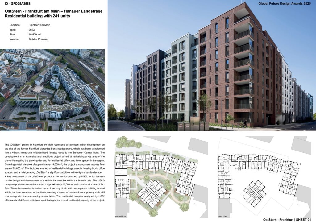 The “OstStern” project in Frankfurt am Main represents a significant urban development on the site of the former Frankfurt Mercedes-Benz headquarters, which has been transformed into a vibrant mixed-use neighborhood, located close to the European Central Bank. The development is an extensive and ambitious project aimed at revitalizing a key area of the city while meeting the growing demand for residential, office, and hotel spaces in the region. Covering a total site area of approximately 19,000 m², the project encompasses a gross floor area of 65,000 m². This includes a variety of residential buildings, a social housing block, office spaces, and a hotel, making “OstStern” a significant addition to the city’s urban landscape. A key component of the “OstStern” project is the section planned by HS02, which focuses on the design and development of a residential complex within the broader site. The HS02-designed portion covers a floor area of approximately 20,000 m² and consists of a total of 241 flats. These flats are distributed across a closed city block, with one separate building located within the inner courtyard of the block, creating a sense of community and privacy while still connecting with the surrounding urban fabric. The residential complex designed by HS02 offers a mix of different unit sizes, contributing to the overall residential capacity of the project.