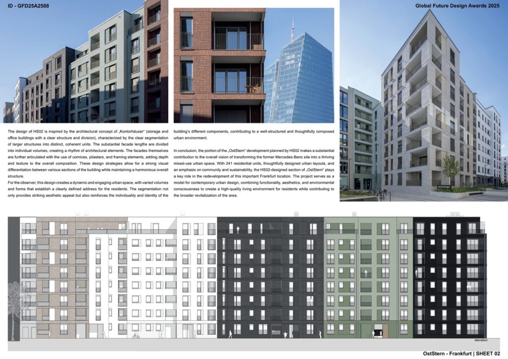– In conclusion, the portion of the “OstStern” development planned by HS02 makes a substantial contribution to the overall vision of transforming the former Mercedes-Benz site into a thriving mixed-use urban space. With 241 residential units, thoughtfully designed urban layouts, and an emphasis on community and sustainability, the HS02-designed section of “OstStern” plays a key role in the redevelopment of this important Frankfurt location. The project serves as a model for contemporary urban design, combining functionality, aesthetics, and environmental consciousness to create a high-quality living environment for residents while contributing to the broader revitalization of the area.