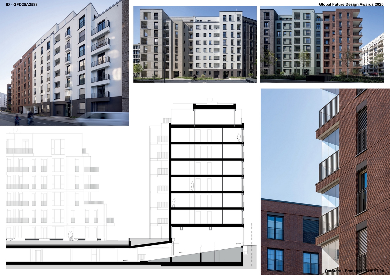 The “OstStern” project in Frankfurt am Main represents a significant urban development on the site of the former Frankfurt Mercedes-Benz headquarters, which has been transformed into a vibrant mixed-use neighborhood, located close to the European Central Bank. The development is an extensive and ambitious project aimed at revitalizing a key area of the city while meeting the growing demand for residential, office, and hotel spaces in the region. Covering a total site area of approximately 19,000 m², the project encompasses a gross floor area of 65,000 m². This includes a variety of residential buildings, a social housing block, office spaces, and a hotel, making “OstStern” a significant addition to the city’s urban landscape. A key component of the “OstStern” project is the section planned by HS02, which focuses on the design and development of a residential complex within the broader site. The HS02-designed portion covers a floor area of approximately 20,000 m² and consists of a total of 241 flats. These flats are distributed across a closed city block, with one separate building located within the inner courtyard of the block, creating a sense of community and privacy while still connecting with the surrounding urban fabric. The residential complex designed by HS02 offers a mix of different unit sizes, contributing to the overall residential capacity of the project.