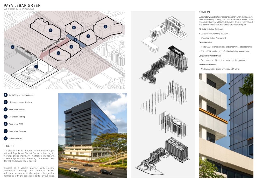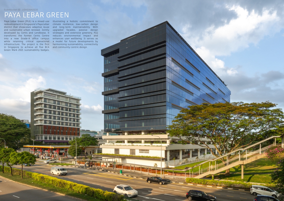 Located in Singapore’s fast-evolving Paya Lebar district, Paya Lebar Green (PLG) is a forward-looking redevelopment that exemplifies the principles of adaptive reuse and sustainable urban regeneration. Jointly developed by Certis and Lendlease, the project transforms the former Certis Centre into a vibrant mixed-use gateway while retaining critical operational infrastructure. Comprising the retrofit of an existing block (PLG North) and the construction of a new Grade-A office building (PLG South), Paya Lebar Green seeks to rejuvenate the precinct by introducing a future-ready model for green, resilient and community-oriented development.