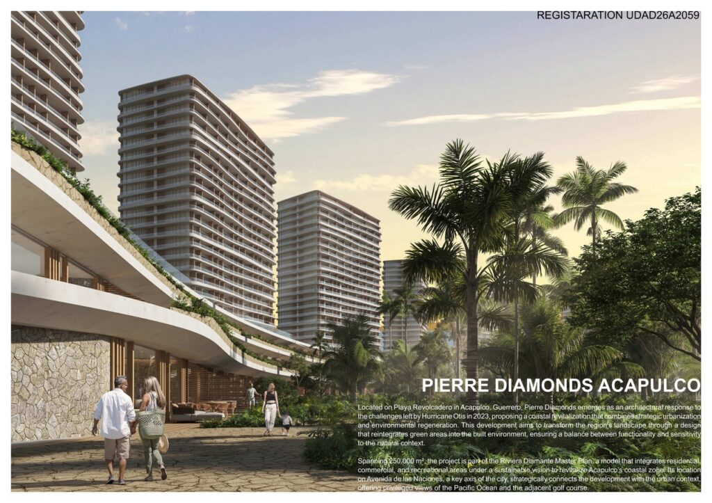 Located on Playa Revolcadero in Acapulco, Guerrero, Pierre Diamonds emerges as an architectural response to the challenges left by Hurricane Otis in 2023, proposing a coastal revitalization that combines strategic urbanization and environmental regeneration. This development transforms the region’s landscape through a design that reintegrates green areas into the built environment, ensuring a balance between functionality and sensitivity to the natural context.