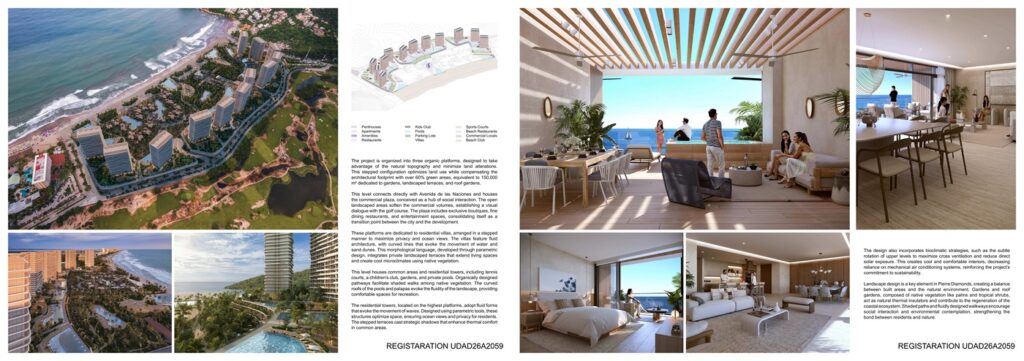 The upper platforms host common areas and residential towers with tennis courts, a children’s club, gardens, and private pools. Organically designed pathways weave through native vegetation, while curved roofs and palapas echo the fluidity of the landscape. The residential towers, shaped with parametric tools, optimize space and guarantee privacy and views. Stepped terraces cast shadows that enhance thermal comfort in shared areas.