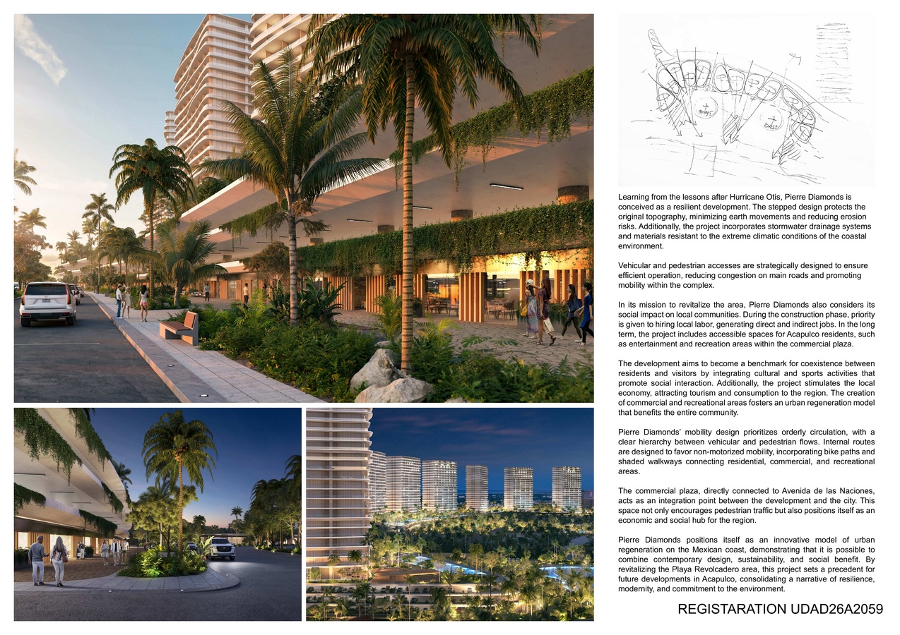 By prioritizing non-motorized mobility, shaded walkways, and bike paths, the project integrates residential, commercial, and recreational uses into a cohesive whole. Positioned as an innovative model of regeneration, Pierre Diamonds demonstrates how contemporary design, sustainability, and social benefit can converge to revitalize Acapulco’s coast.