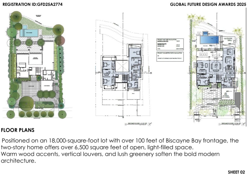 Positioned on an 18,000-square-foot lot with over 100 feet of Biscayne Bay frontage, the two-story home offers over 6,500 square feet of open, light-filled space. Warm wood accents, vertical louvers, and lush greenery soften the bold modern architecture.