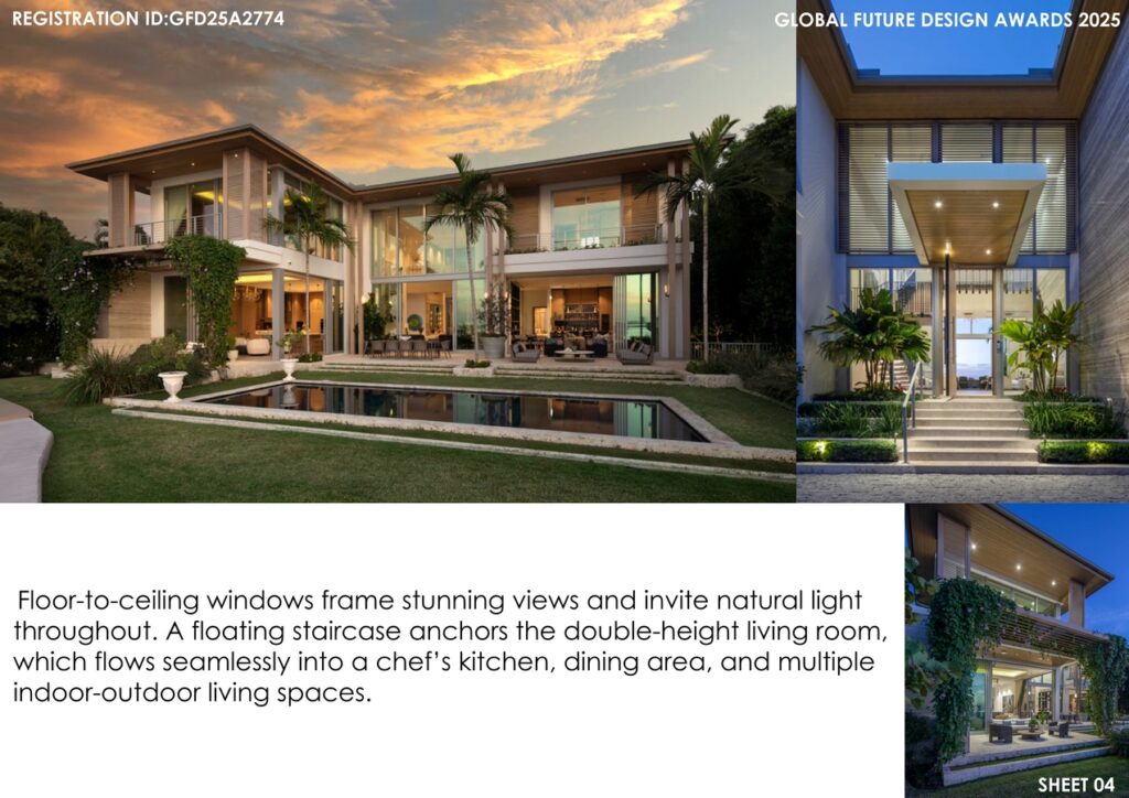 Floor-to-ceiling windows frame stunning views and invite natural light throughout. A floating staircase anchors the double-height living room, which flows seamlessly into a chef’s kitchen, dining area, and multiple indoor-outdoor living spaces.