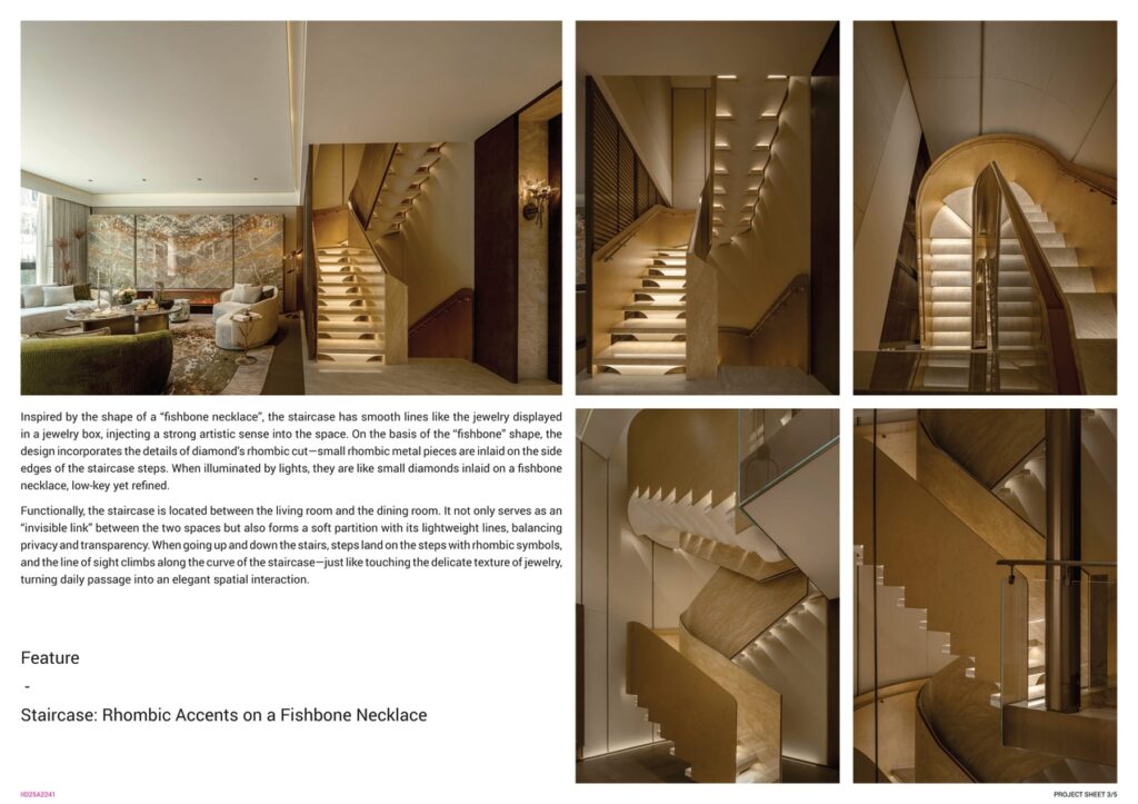 Shaped like a “fishbone necklace”, the staircase incorporates tiny rhombic metal inlays along step edges. It serves as a visual and functional link between dining and living spaces, turning movement into a tactile, jewelry-like experience.