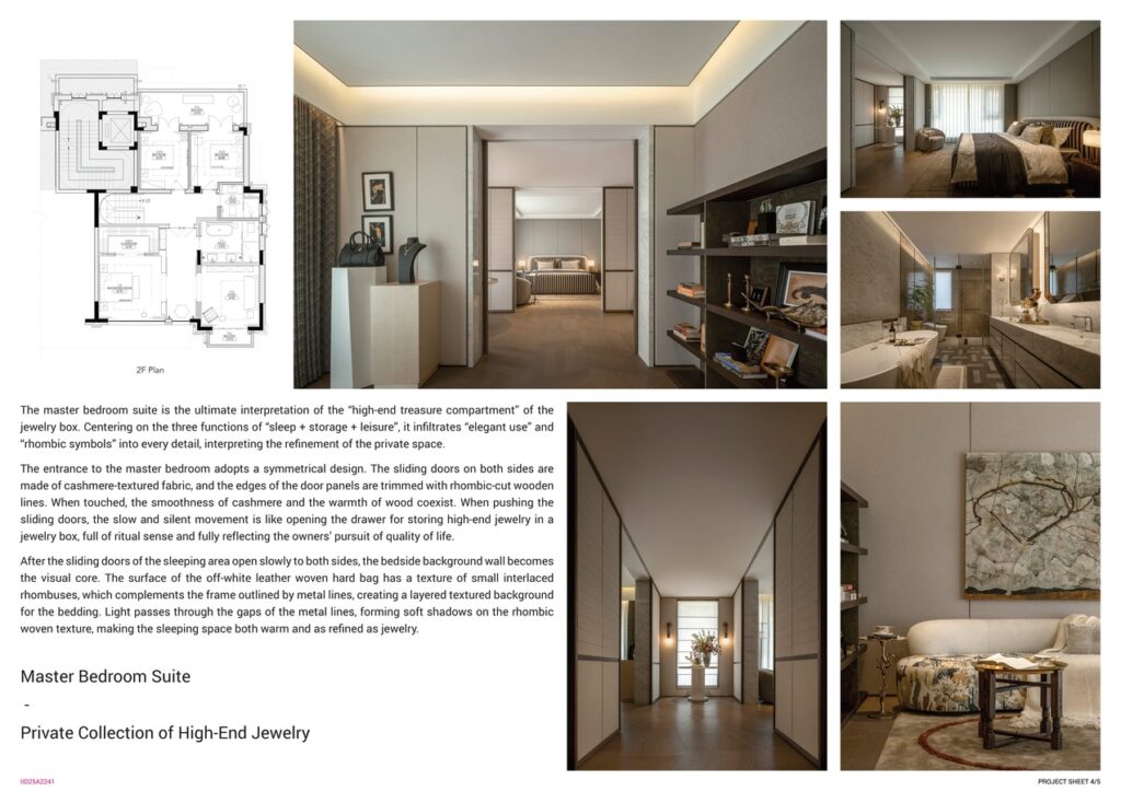 Conceived as a “private treasure compartment”, the suite integrates symmetry, cashmere-textured sliding doors, and woven leather rhombic patterns. The study acts as an intimate “treasure corner”, while the master bathroom features an octagonal, diamond-cut mirror cabinet that lights up softly when opened.