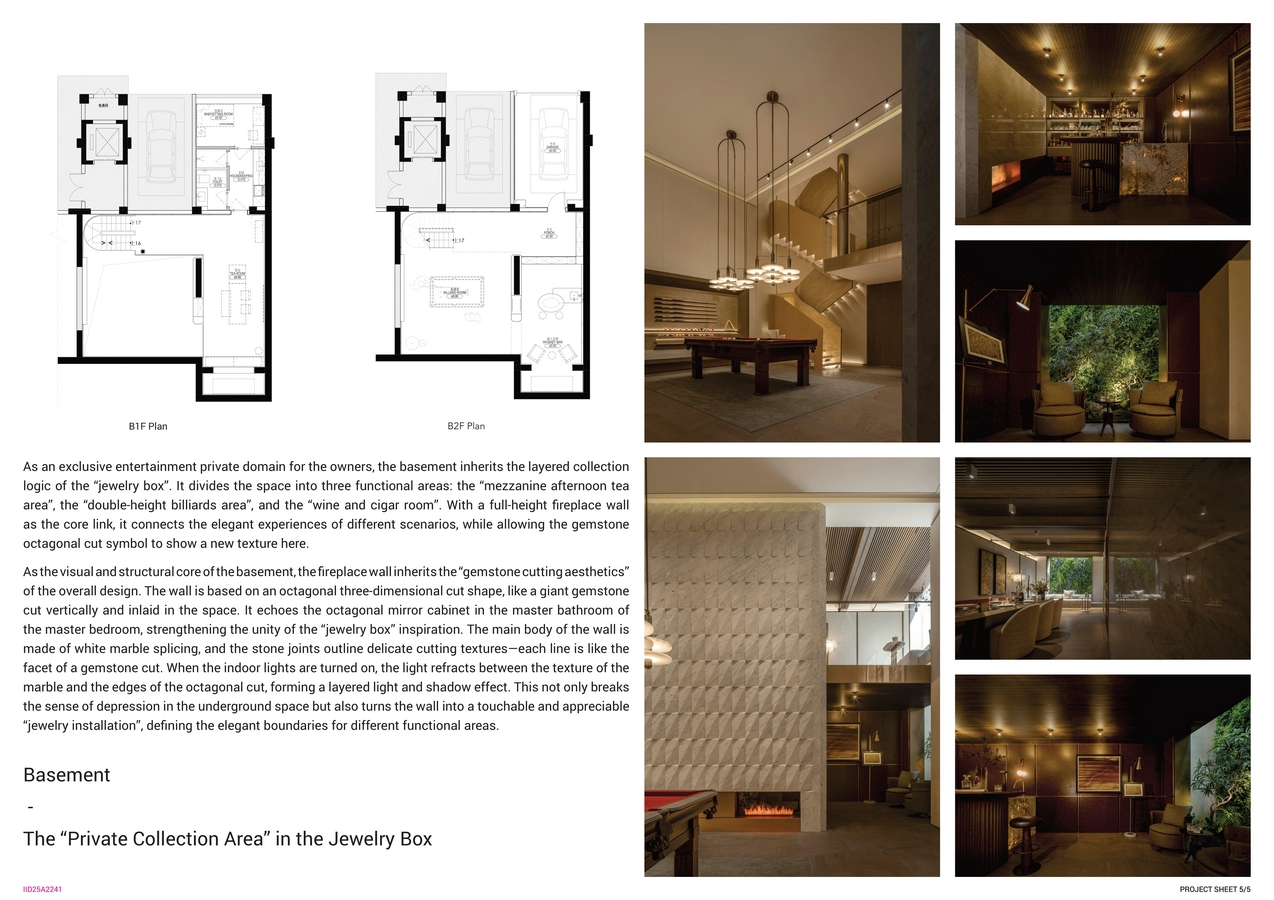 Designed as a “private collection area”, the basement includes a tea mezzanine, billiards zone, and wine-cigar room. A dramatic octagonal-cut fireplace wall—crafted like a giant gemstone facet—anchors the space, reflecting the design language of the master suite and creating shimmering, layered light effects.