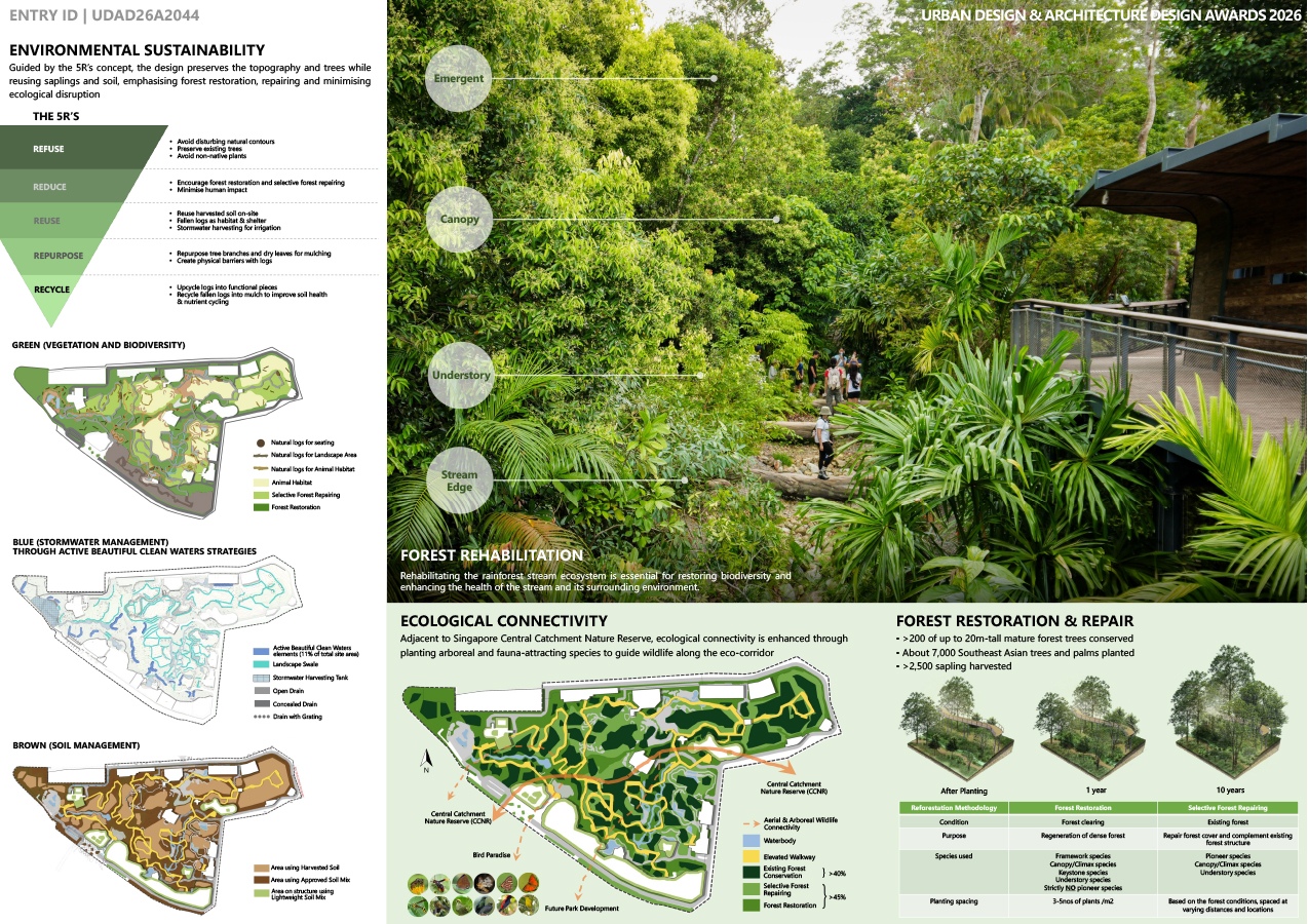 Working with the site’s natural landforms and processes, the design emphasises ecological preservation and climate resilience. Over 40% of the existing forest has been preserved—including over 200 mature trees up to 20 metres tall—as an ecological backbone supporting habitat continuity and biodiversity. Additionally, over 45% of the site has undergone ecological rehabilitation through Forest Restoration and Selective Forest Repair, enhancing forest structure, ecosystem functions and native species regeneration.