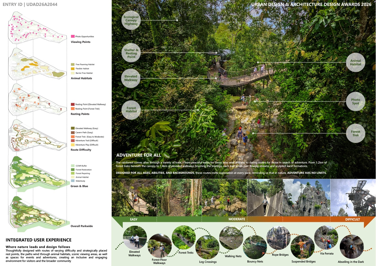 The diverse network of trails accommodates mobility of all levels, from gentle walks to adrenaline-fuelled routes through elevated paths, forest treks, streams and karst formations, the design makes the rainforest accessible to everyone, foregrounding the belief that adventure knows no limits.
